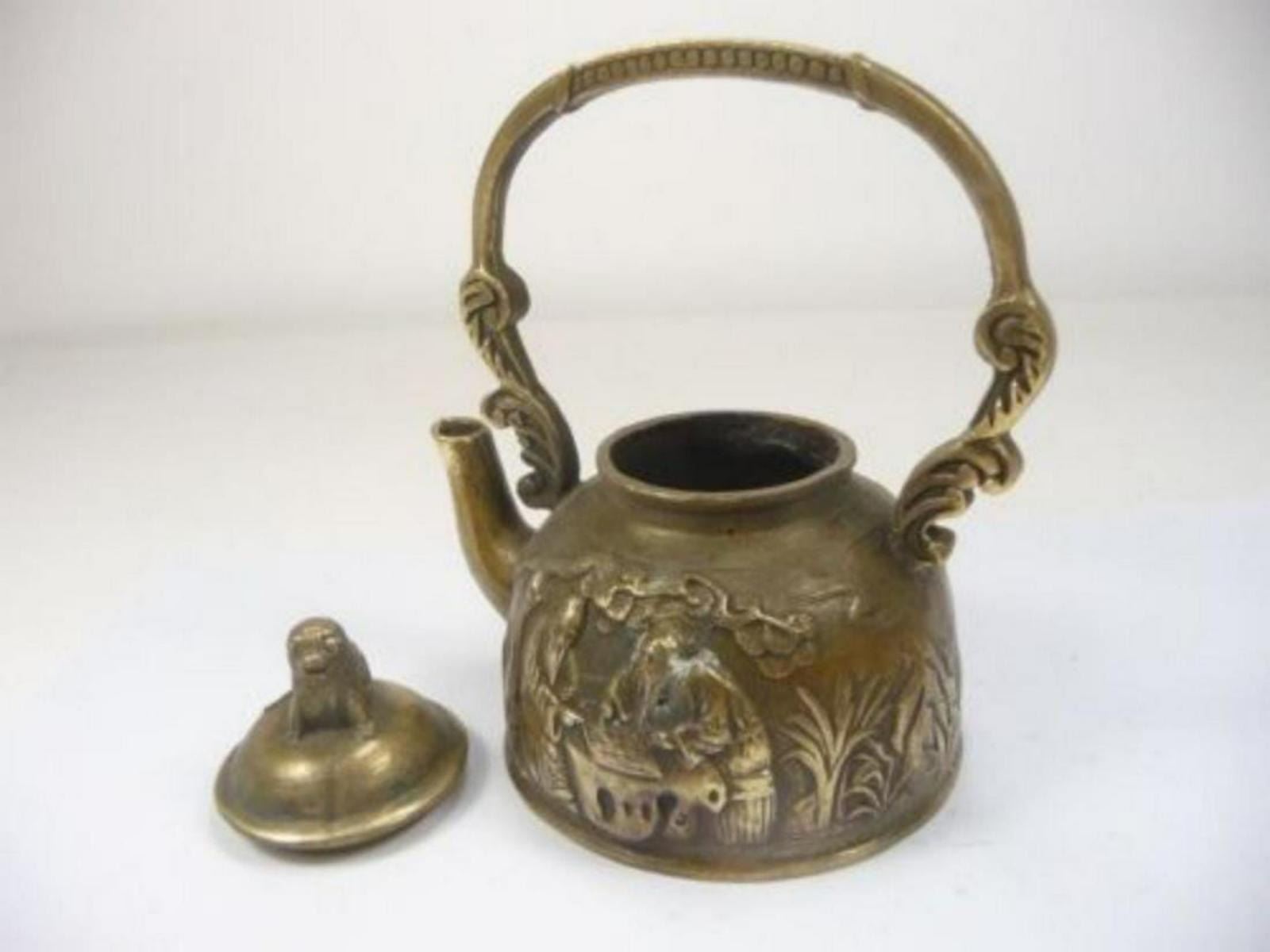 Description: Antique Chinese Copper Teapot/winepot;Material: Copper bronze;(L x W x H)Size: (10.8 X 8.2 X 11)CM