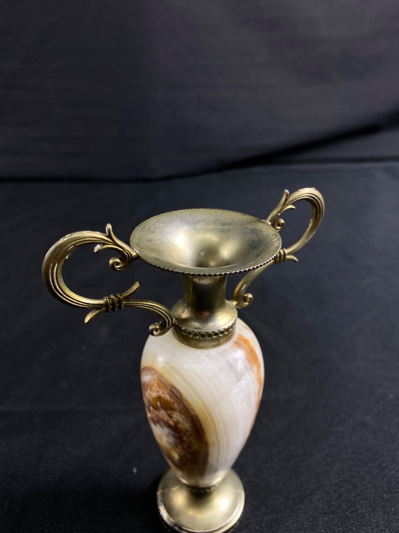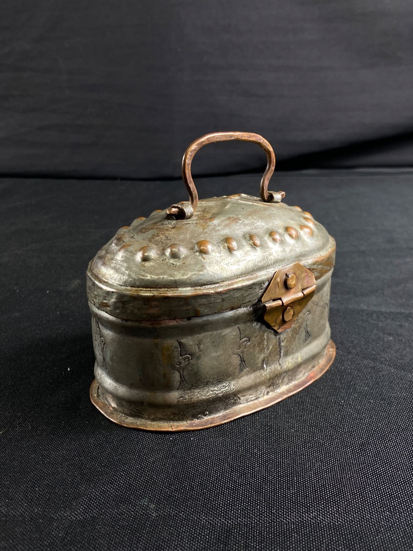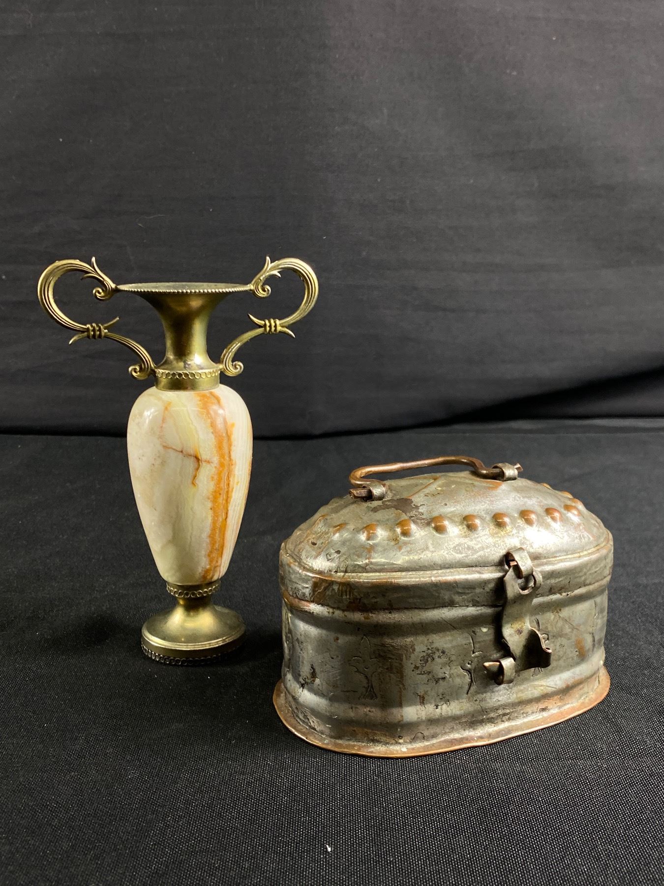 Old Embossed Metal Tin Hinged Box w/ Handle & Latch & 5" H Brass & Stone Vase.