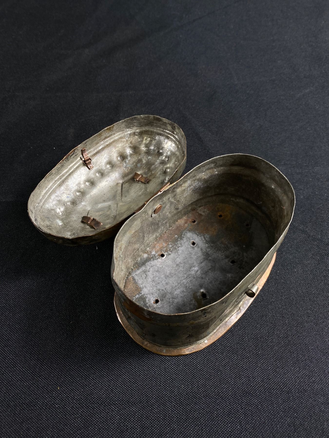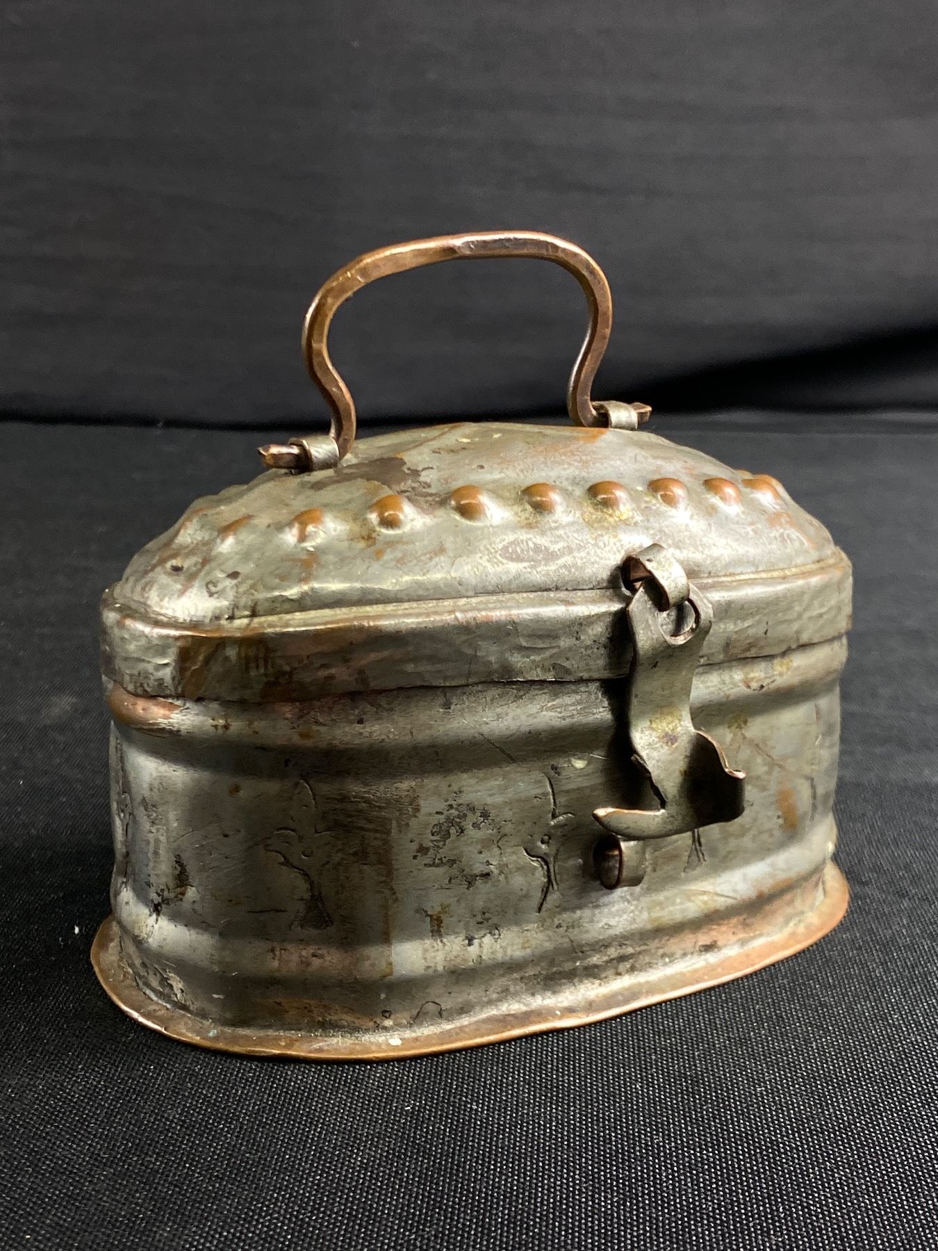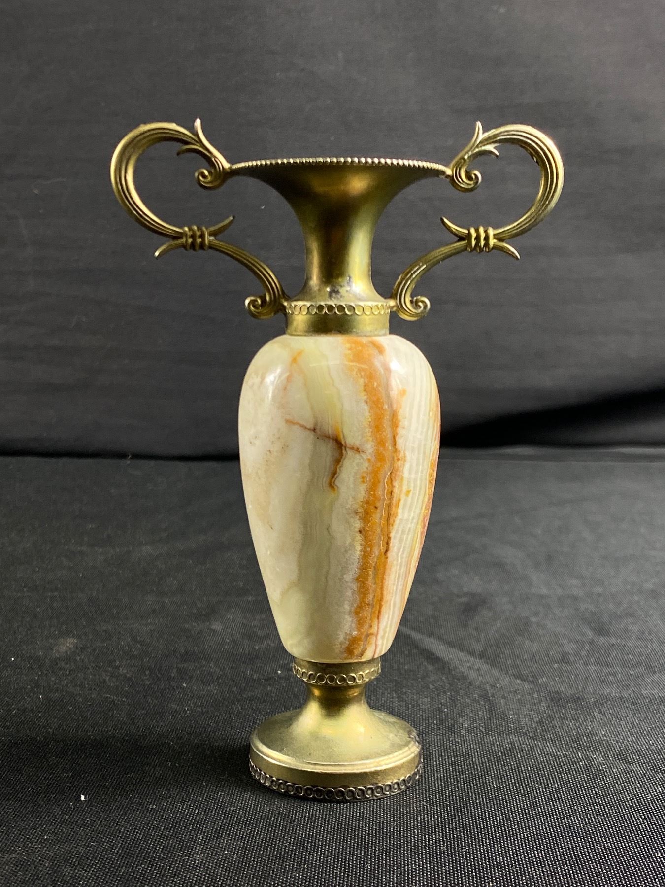 Old Embossed Metal Tin Hinged Box w/ Handle & Latch & 5" H Brass & Stone Vase.
