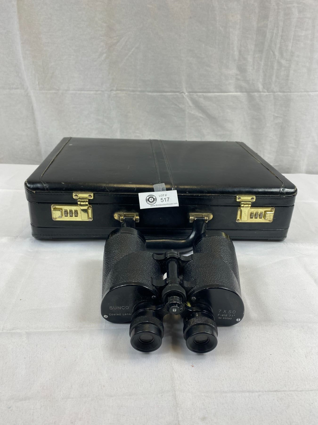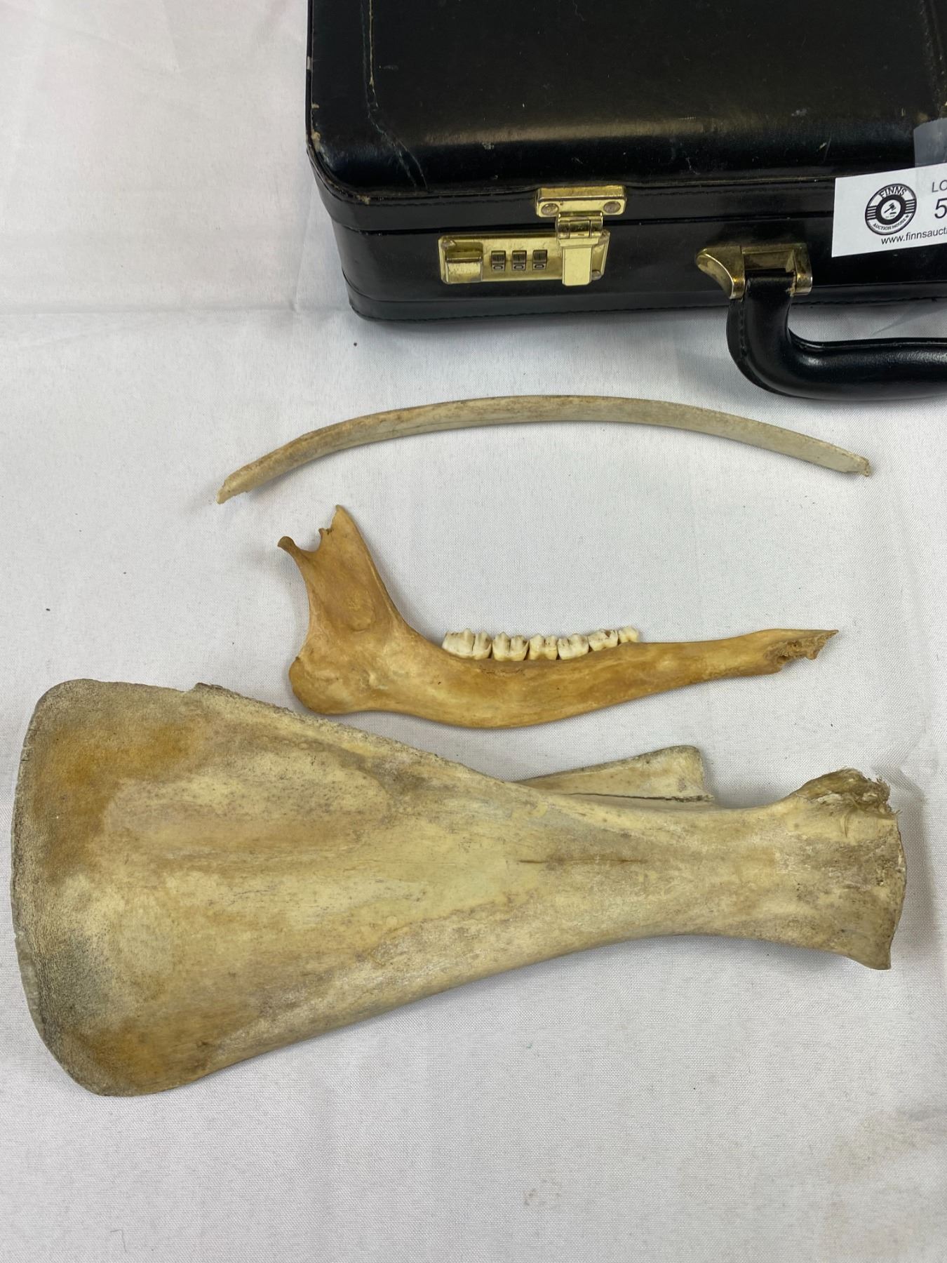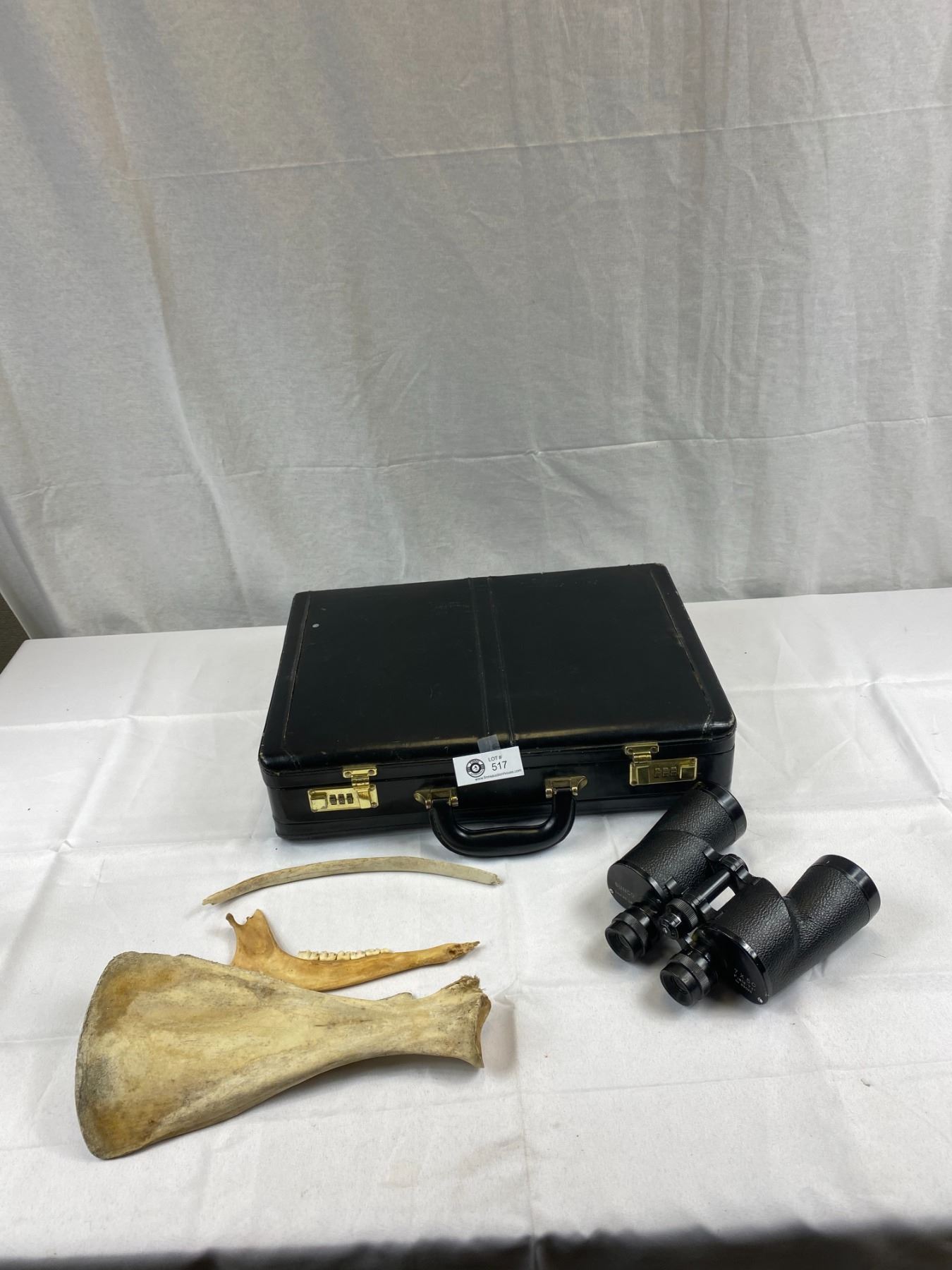 Older Leather Briefcase, Pair Of Binoculars And Old Animal Bones