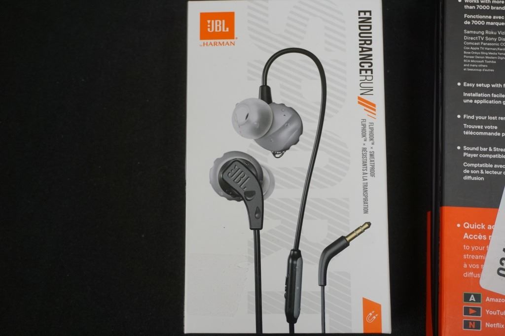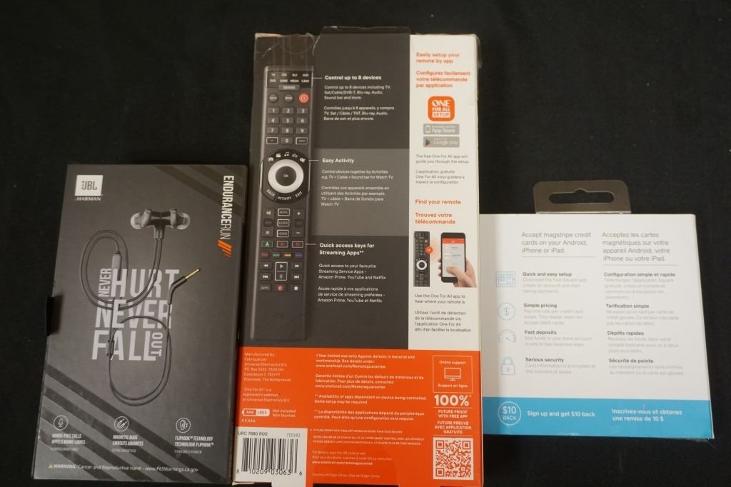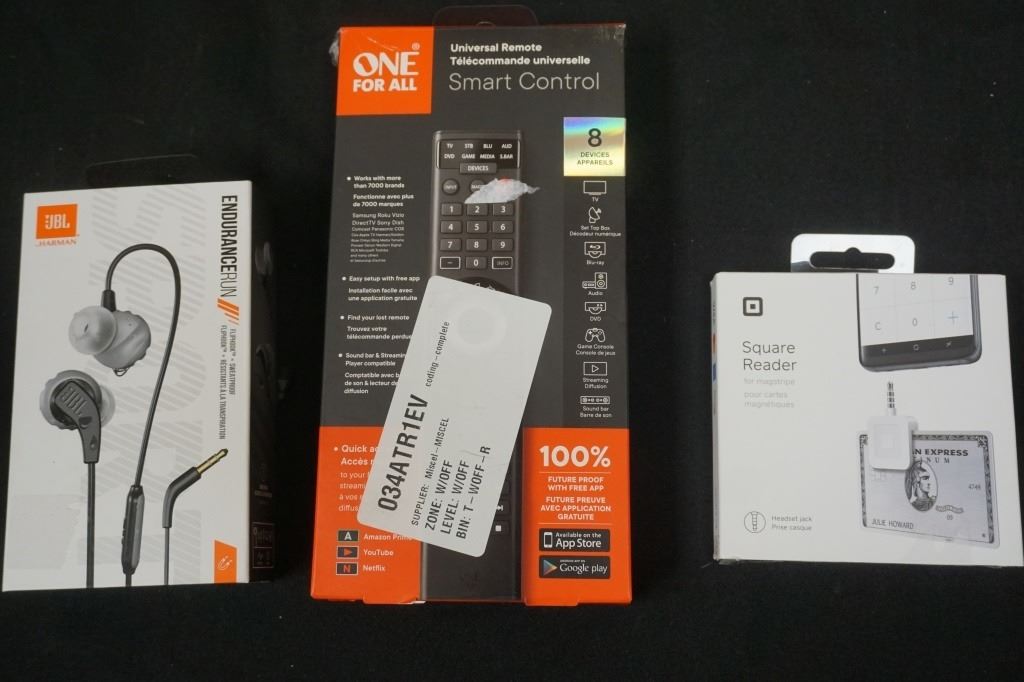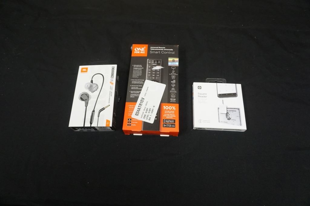 One For All Smart 8-Device Universal Remote Control, JBL Endurance Run Headphones and Mobile Square Reader Retail $100