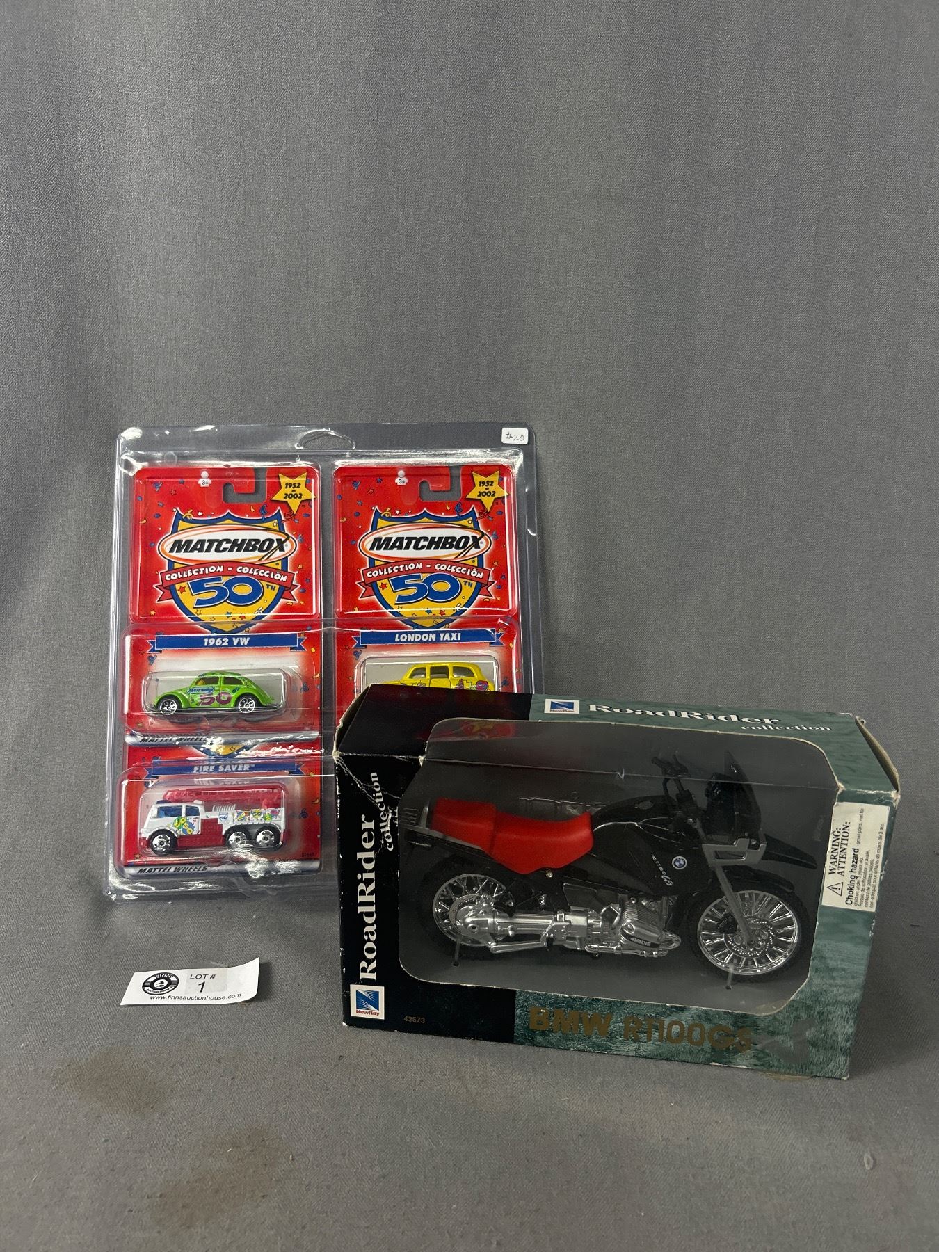 One Set Of 4 - 50th Anniversary Matchbox & New Rider BMW R1100GS Motor Cycle Die Cast Metal Collectibles In Original Packages