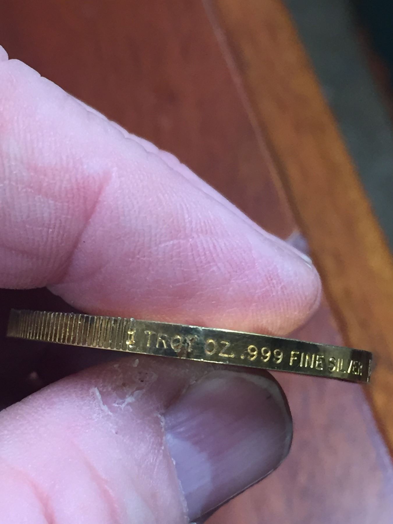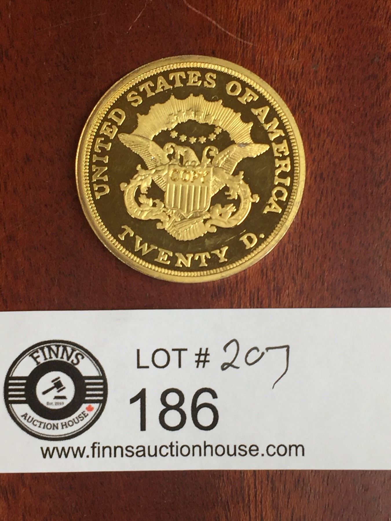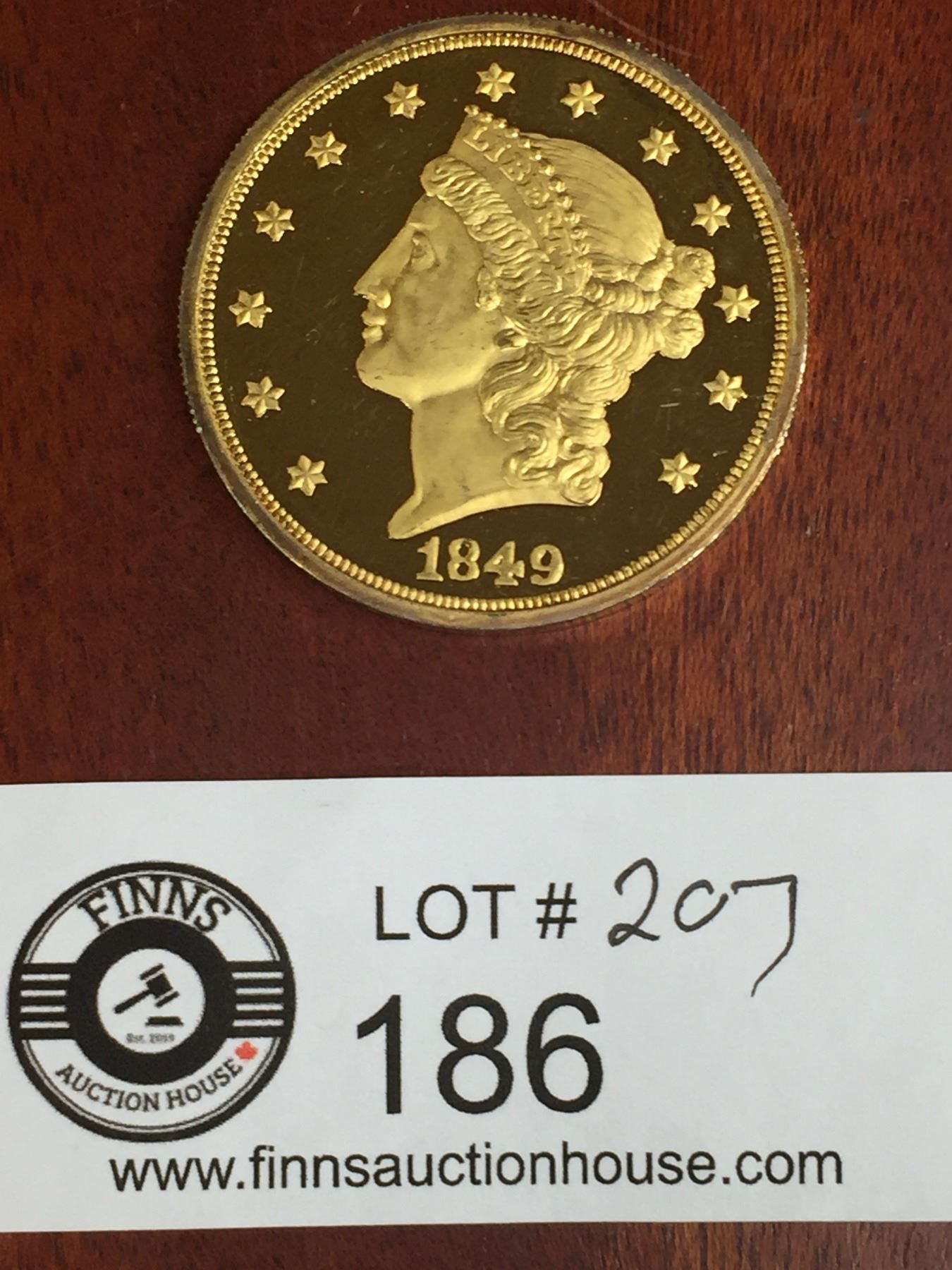 One Troy Ounce .999 Silver Gold Plated USA Twenty D Coin. COPY of 1849 Dollar