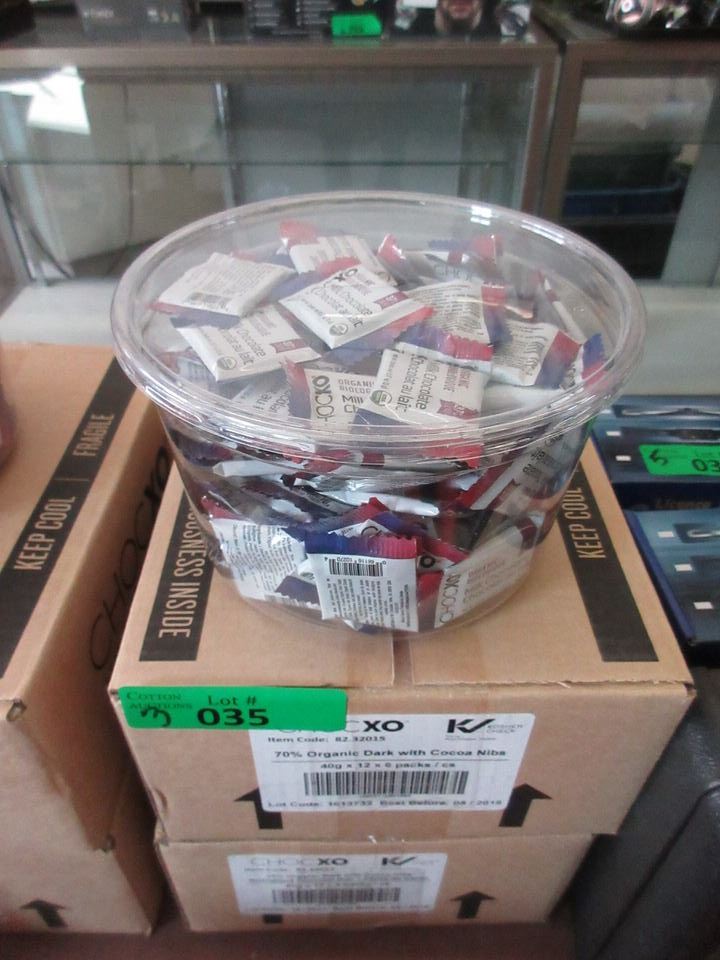 Tub of milk chocolate bites and 2 cases of 70% dark chocolate bars.