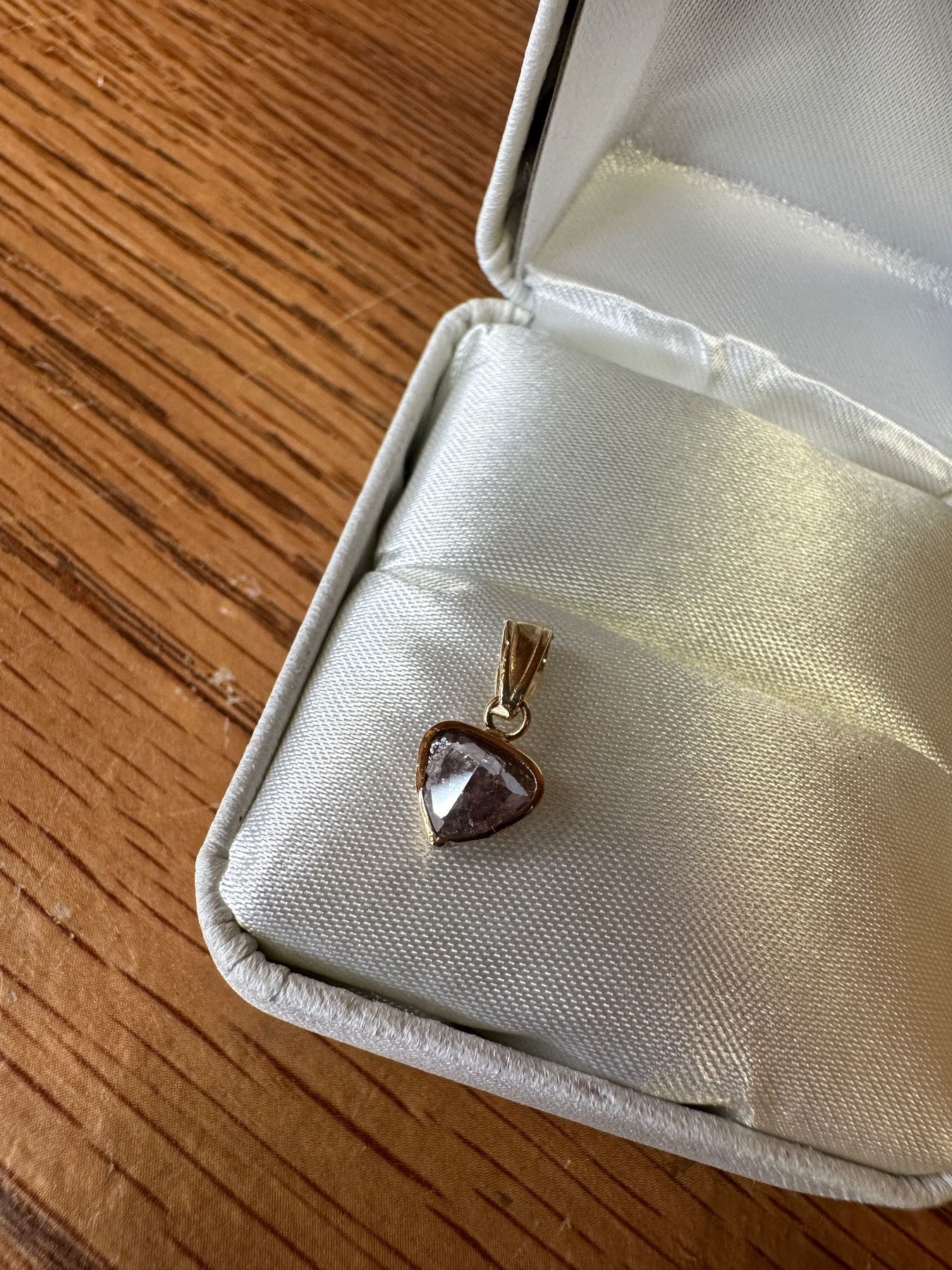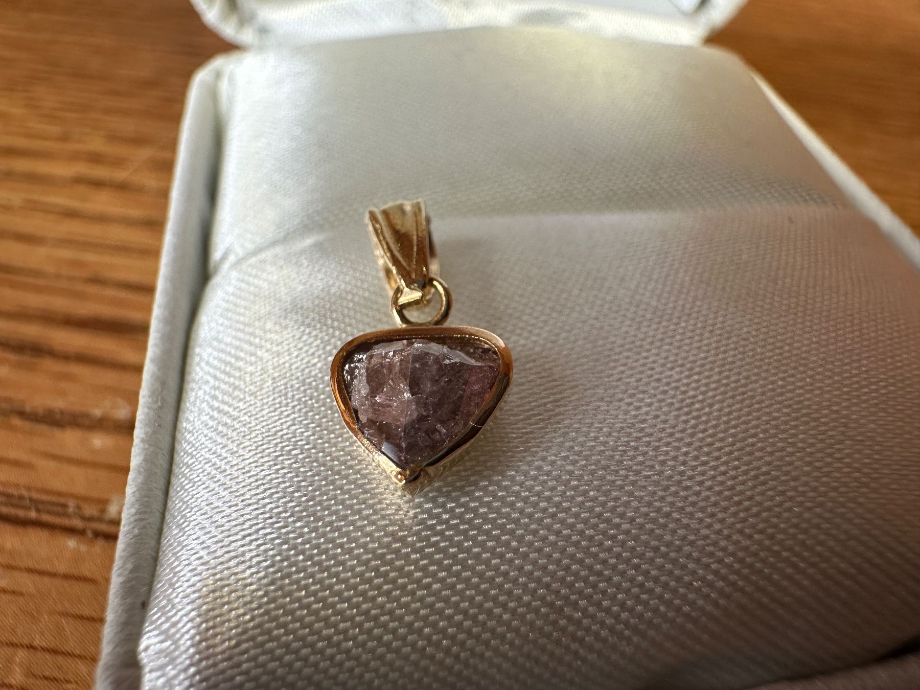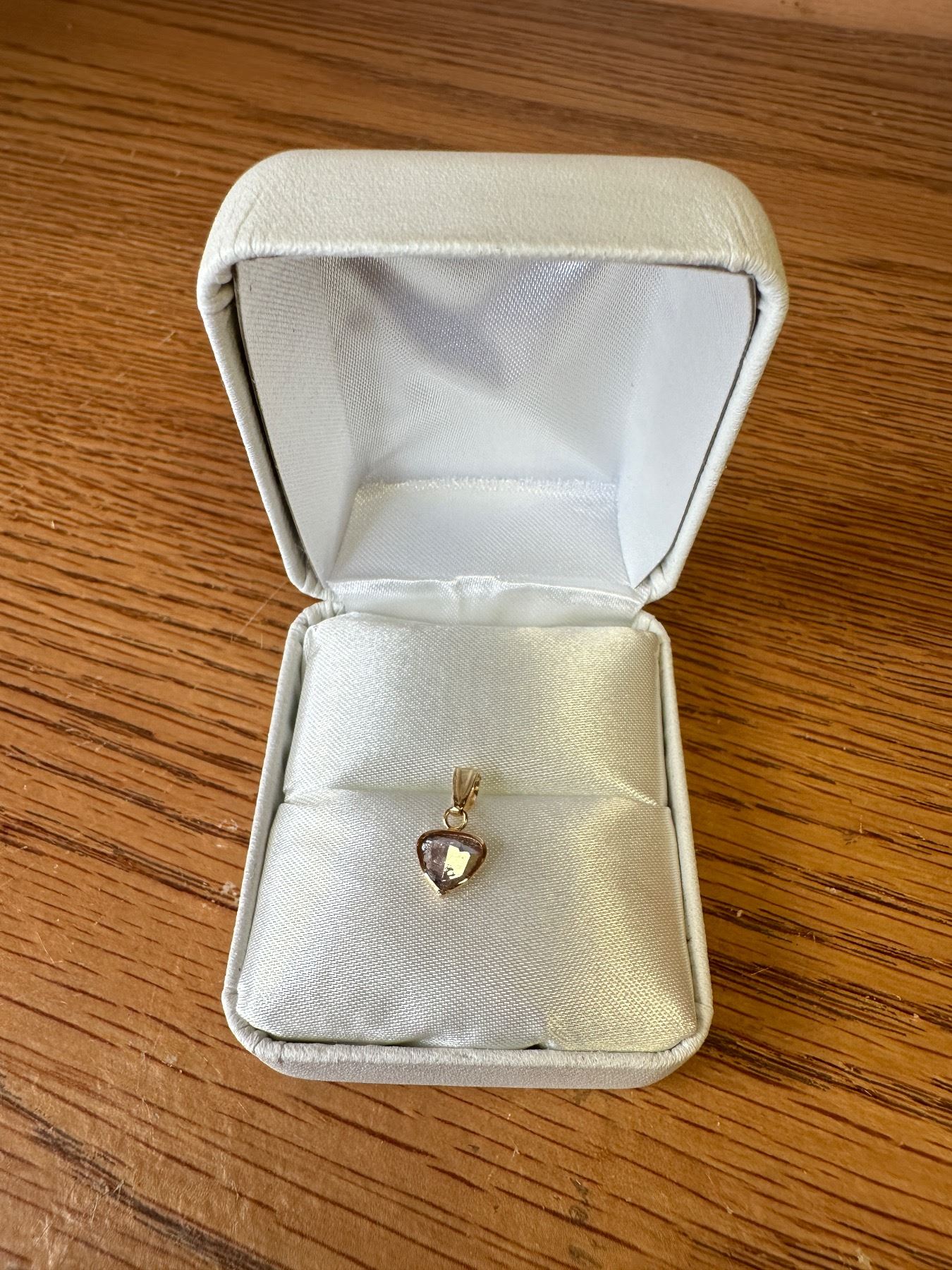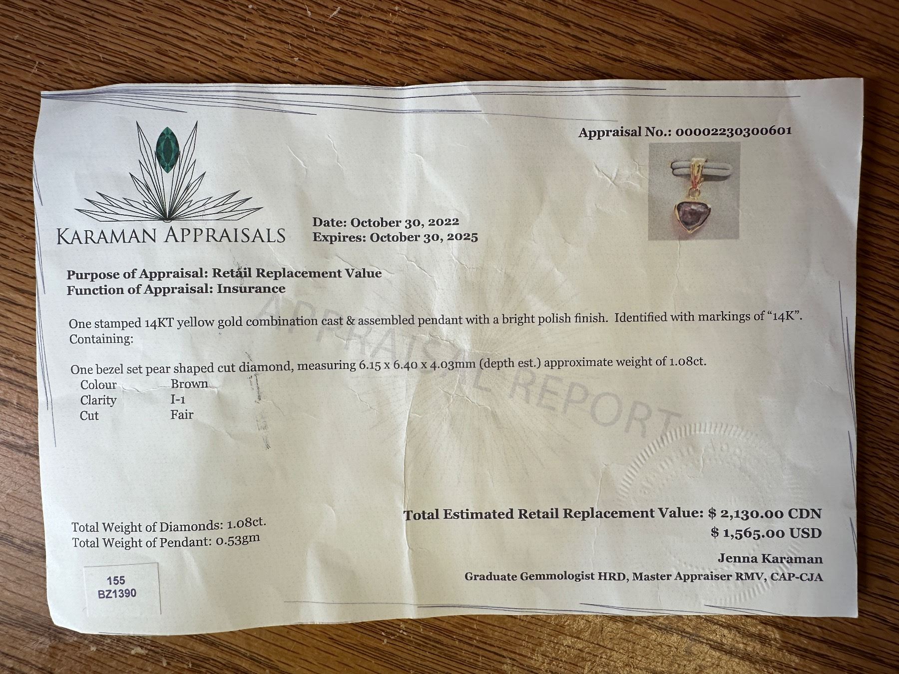 One bezel set pear-shaped cut diamond, measuring 6.15 x 6.40 x 4.03mm w/one stamped 14k yellow gold combination cast & assembled pendant w/a bright polish finish