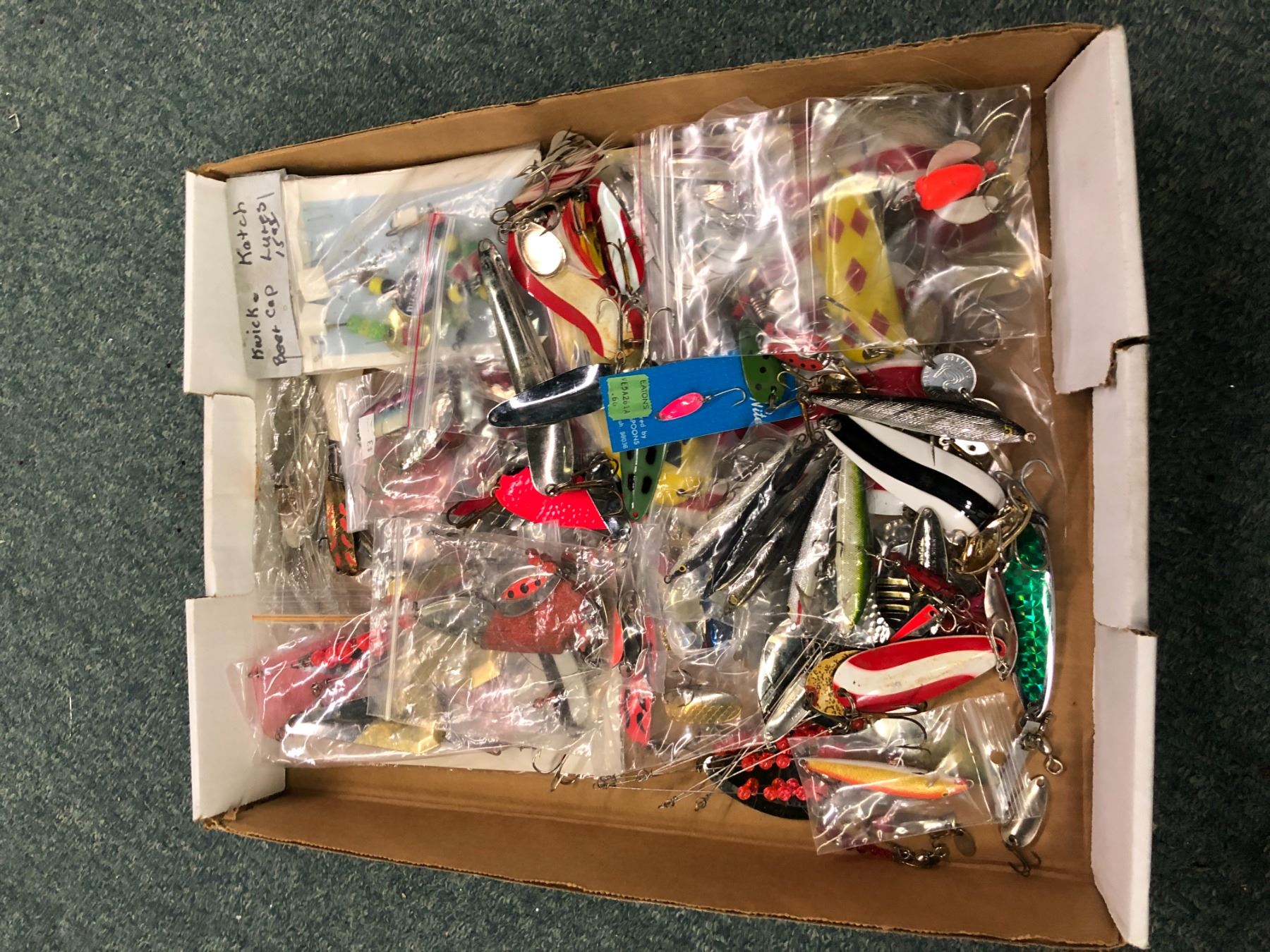 One box full of fresh water fishing tackle - spoons, gangtrolls etc.