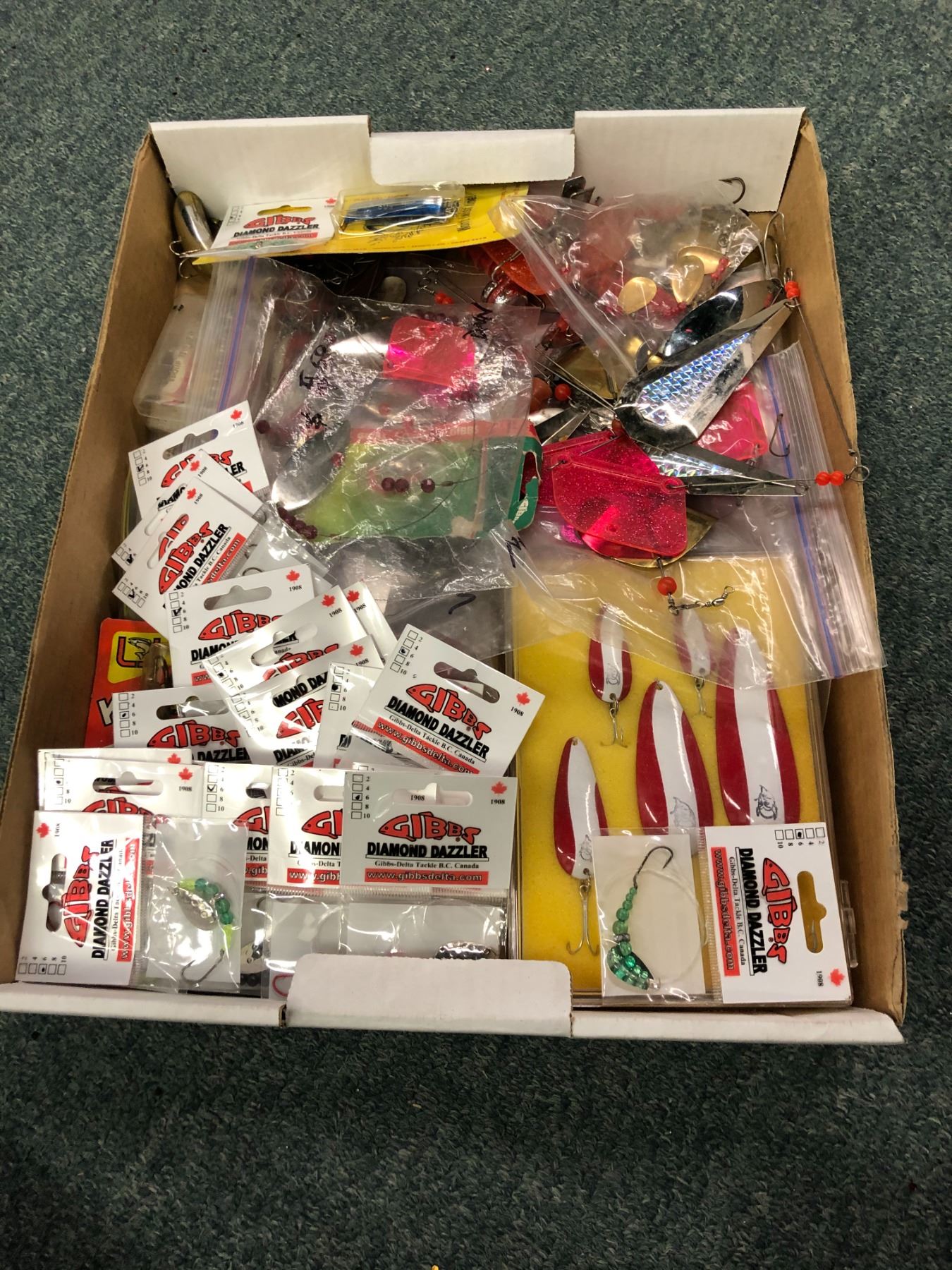 One box full of fresh water fishing tackle - spoons, gangtrolls etc.