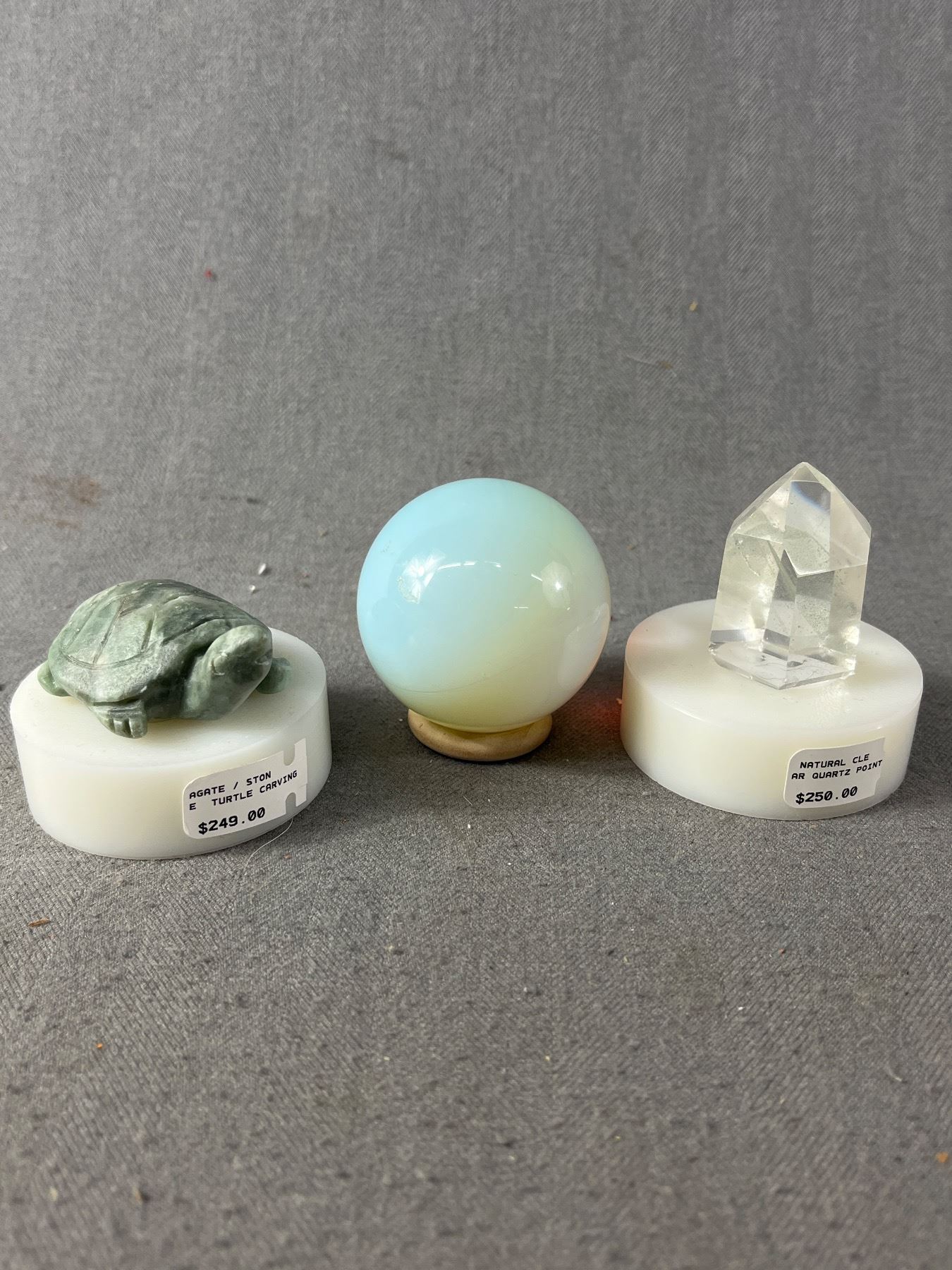 Opalite Sphere Glass, Agate Stone Turtle Carving & Natural Clear Quartz Point. Each Retails Around $250.00 Each