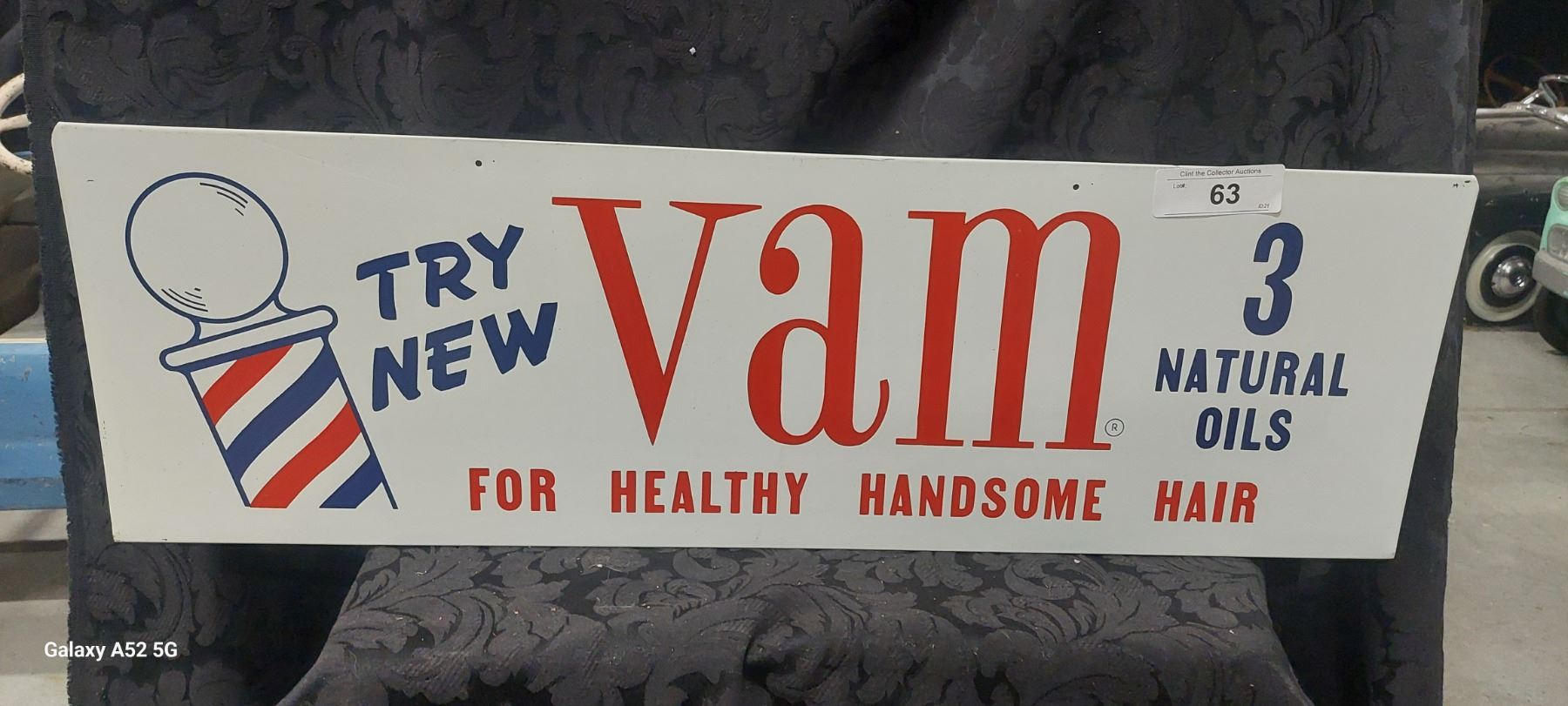 Originals 50s counter flange metal barber sign Vam 28" x 10"
