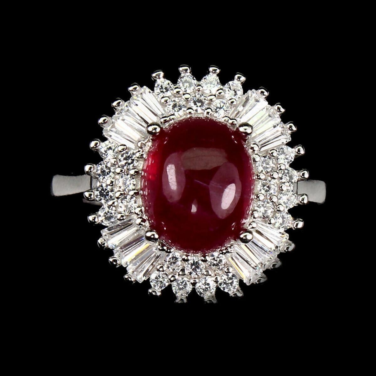 925 STERLING SILVER;PLATE....14K WHITE GOLD;RING SIZE _-8 (resizeable)MAIN STONE-RUBY;OTHER GEMS-CUBIC ZIRCONIATOTAL WEIGHT-32.48 CT (TOTAL WEIGHT OF SILVER + STONE)DIMENSION* STONE 10.0 X 8.0 MM. * CZ 1.0 TO 3.0 X 1.5 MM. * RING SIZE 8.0 * FACE RING 18.0 X 16.0 MM.MAIN STONE SHAPE-OVAL CABOCHON;MAIN STONE COLOR-TOP BLOOD RED;CLARITY/GRADE-TRANSLUCENT;LUSTER-CHARMING;TREATMENT- Yes;ORIGIN-MADAGASCAR;HARDNESS-9;