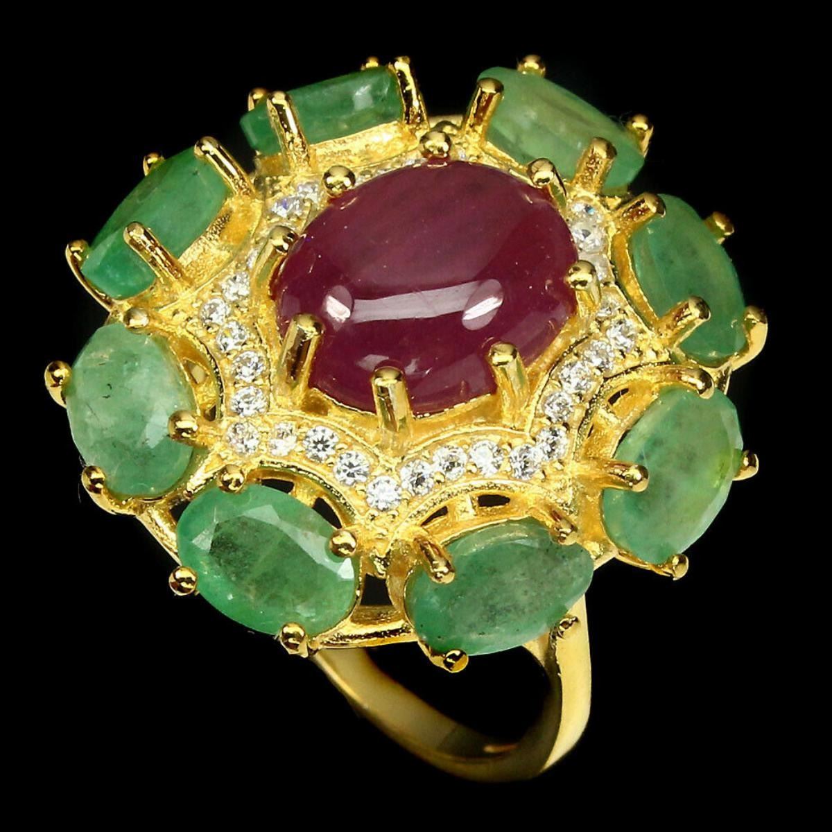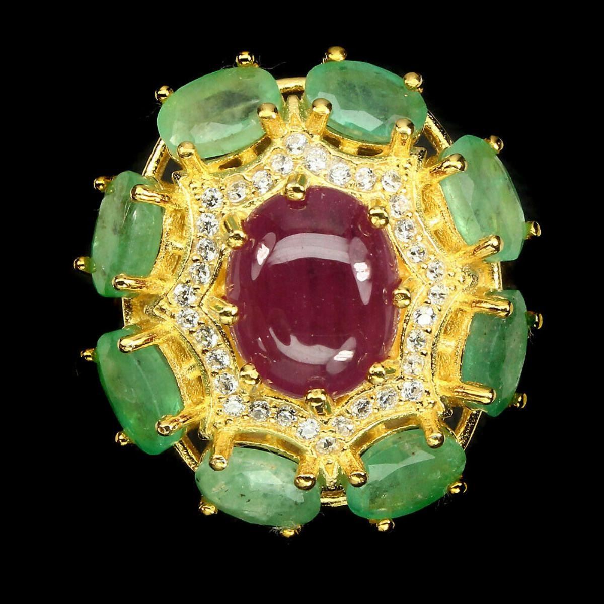 925 STERLING SILVER;PLATE---14K YELLOW GOLD;RING SIZE7(resizeable)MAIN STONE-RUBY;OTHER GEMS-CUBIC ZIRCONIA,EMERALD;TOTAL WEIGHT-31.80 CT (TOTAL WEIGHT OF SILVER + STONE)DIMENSION* STONE 6.0 X 4.0 TO 10.0 X 8.0 MM. * CZ 1.0 MM. * RING SIZE 7.0 * FACE RING 23.0 X 22.0 MM.MAIN STONE SHAPE-OVAL CABOCHON;MAIN STONE COLOR-TOP RICH RED PINK;LUSTERGORGEOUS;TREATMENT- Yes;ORIGIN-MOZAMBIQUE;HARDNESS-7.5 - 9.0;
