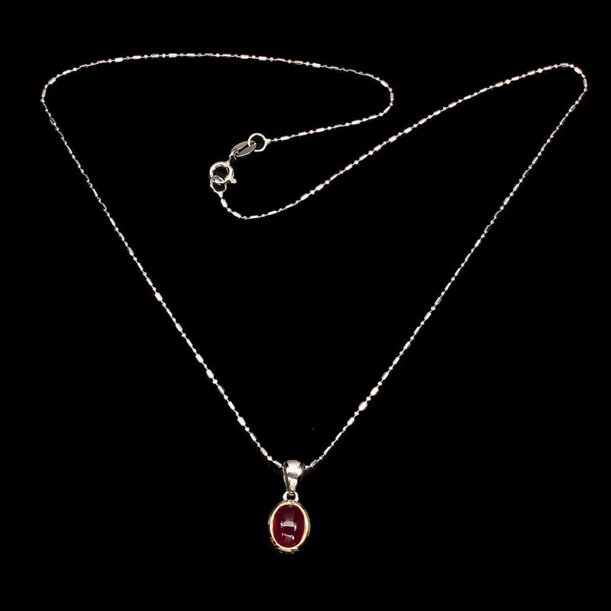 925 STERLING SILVER;PLATE2-TONE WHITE & ROSE 14K GOLDLENGTH (INCHES)16;MAIN STONE-RUBY;TOTAL WEIGHT-14.24 CT (TOTAL WEIGHT OF SILVER + STONE)DIMENSION-* STONE 8.0 X 6.0 MM. * STONES PART LENGTH 17.0 X 8.0 MM.MAIN STONE SHAPE-OVAL CABOCHON;MAIN STONE COLOR-TOP RICH RED;TREATMENT-Yes;ORIGIN-AFRICA;