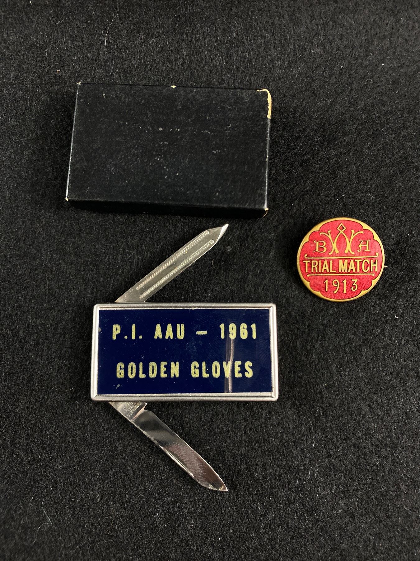 P.I. AAU-1961 Golden Gloves MoneyClip/Knife & 1913 Trial Match Pin