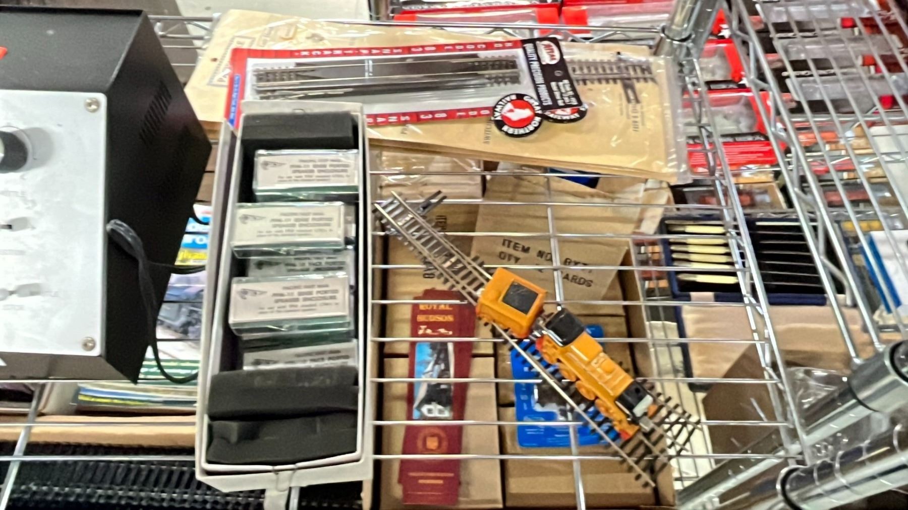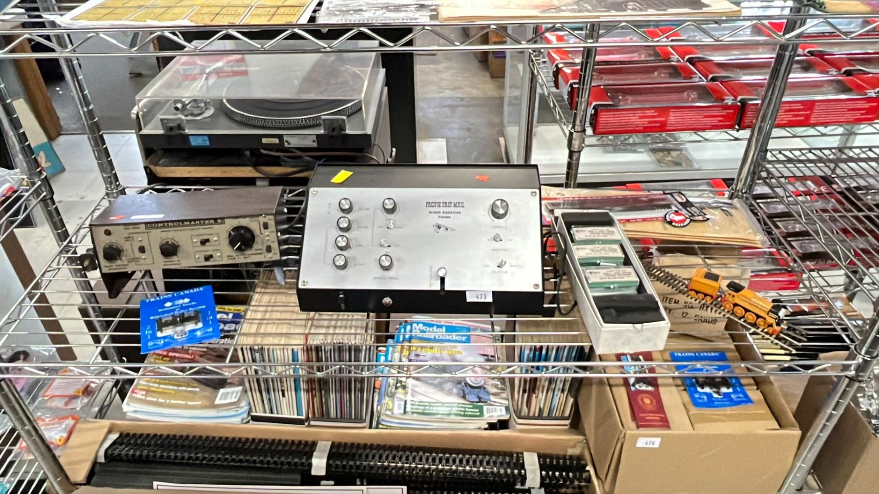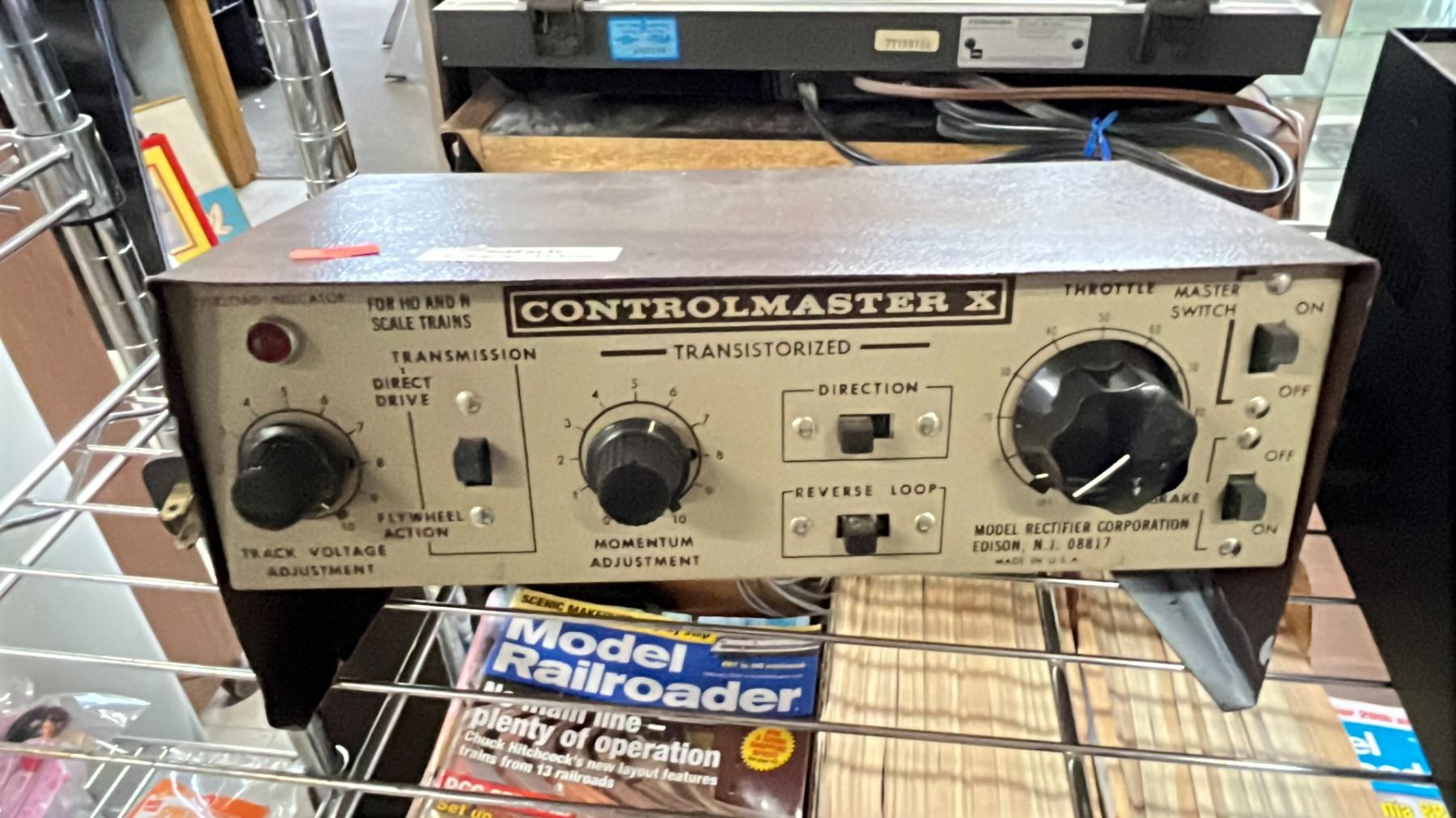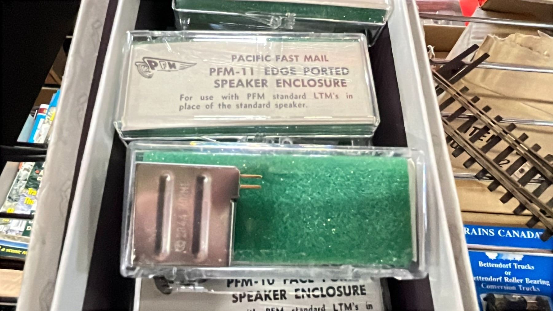 PACIFIC FAST MAIL MARK 2 MODEL RAILROAD SOUND MACHINE WITH POWER CORD, CONTROL MASTERX MODEL TRAIN CONTROL PANEL FOR HO + N SCALE MODEL TRAINS, BOX OF SPEAKER ENCLOSURES & SOME MODEL TRAIN TRACKS