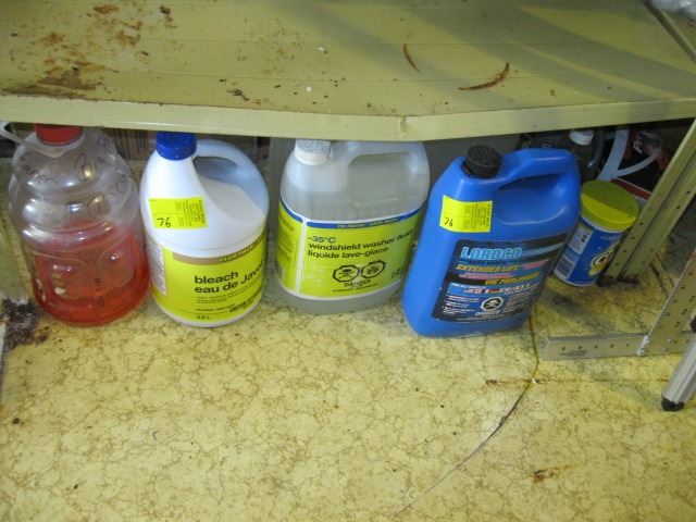 PAIL OF ANTIFREEZE, BLEACH, ETC.