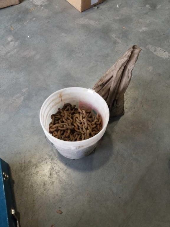 PAIL OF HEAVY DUTY CHAIN AND BAG OF TIRE CHAIN