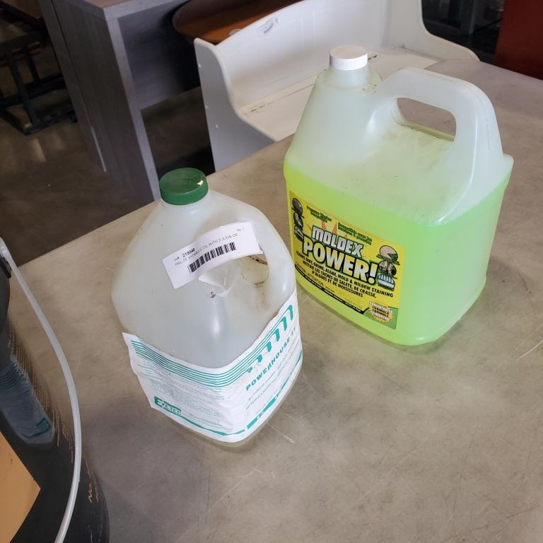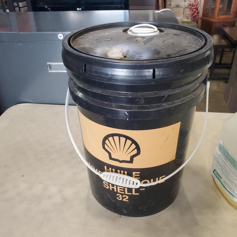 PAIL OF HYDRAULIC OIL 1/4 FULL WITH 2 JUGS OF CLEANERS