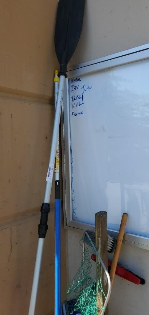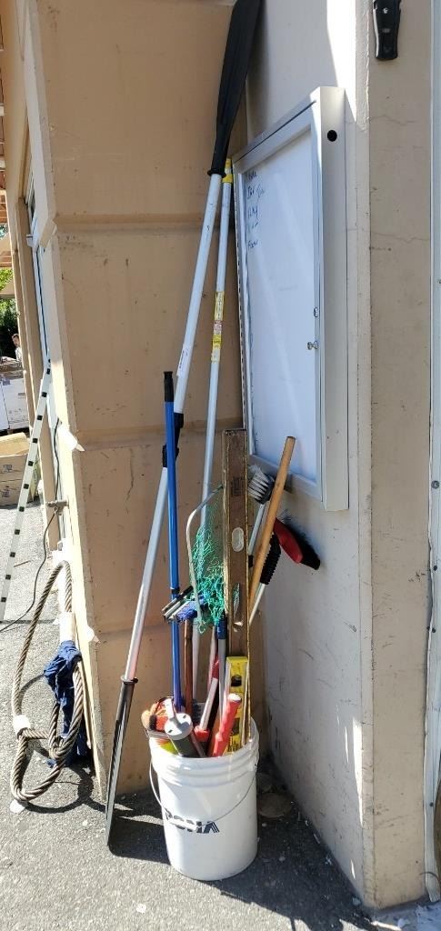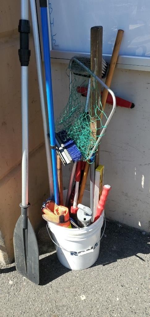 PAIL OF TOOLS, BRUSHES, NET AND MORE