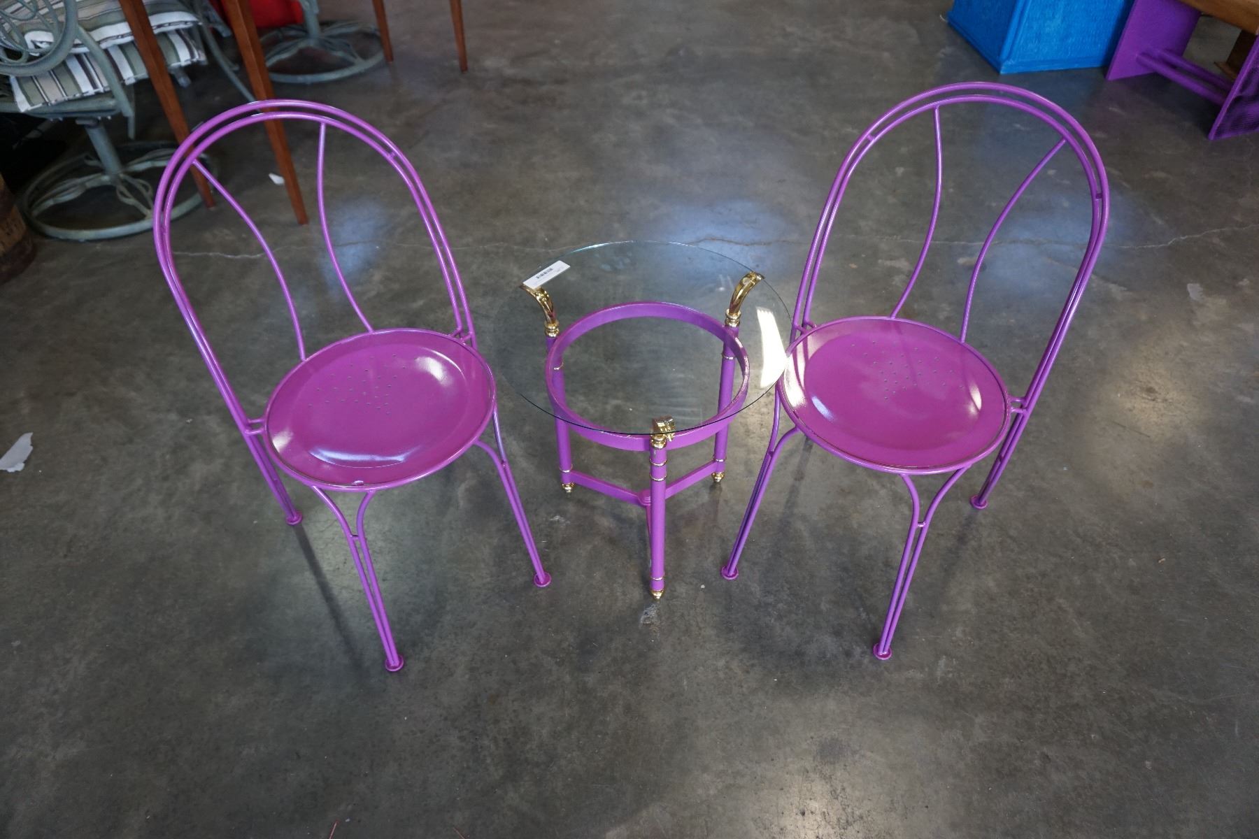 PAINTED PINK GLASSTOP SIDE TABLE AND 2 PINK METAL CHAIRS