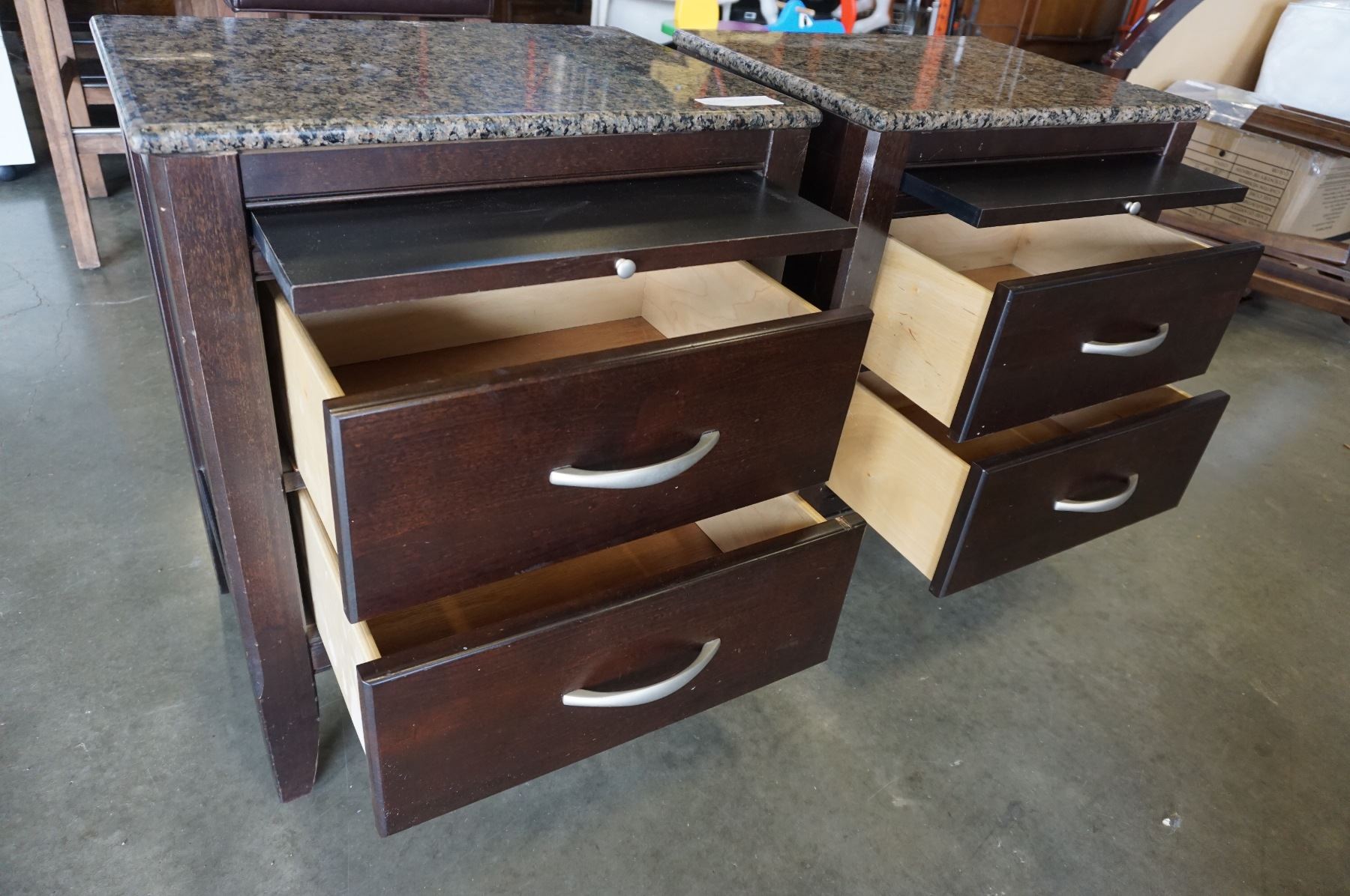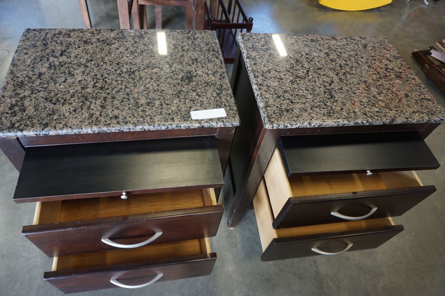 PAIR OF 2 DRAWER STONE TOP END TABLES ONE WITH REPAIRED TOP
