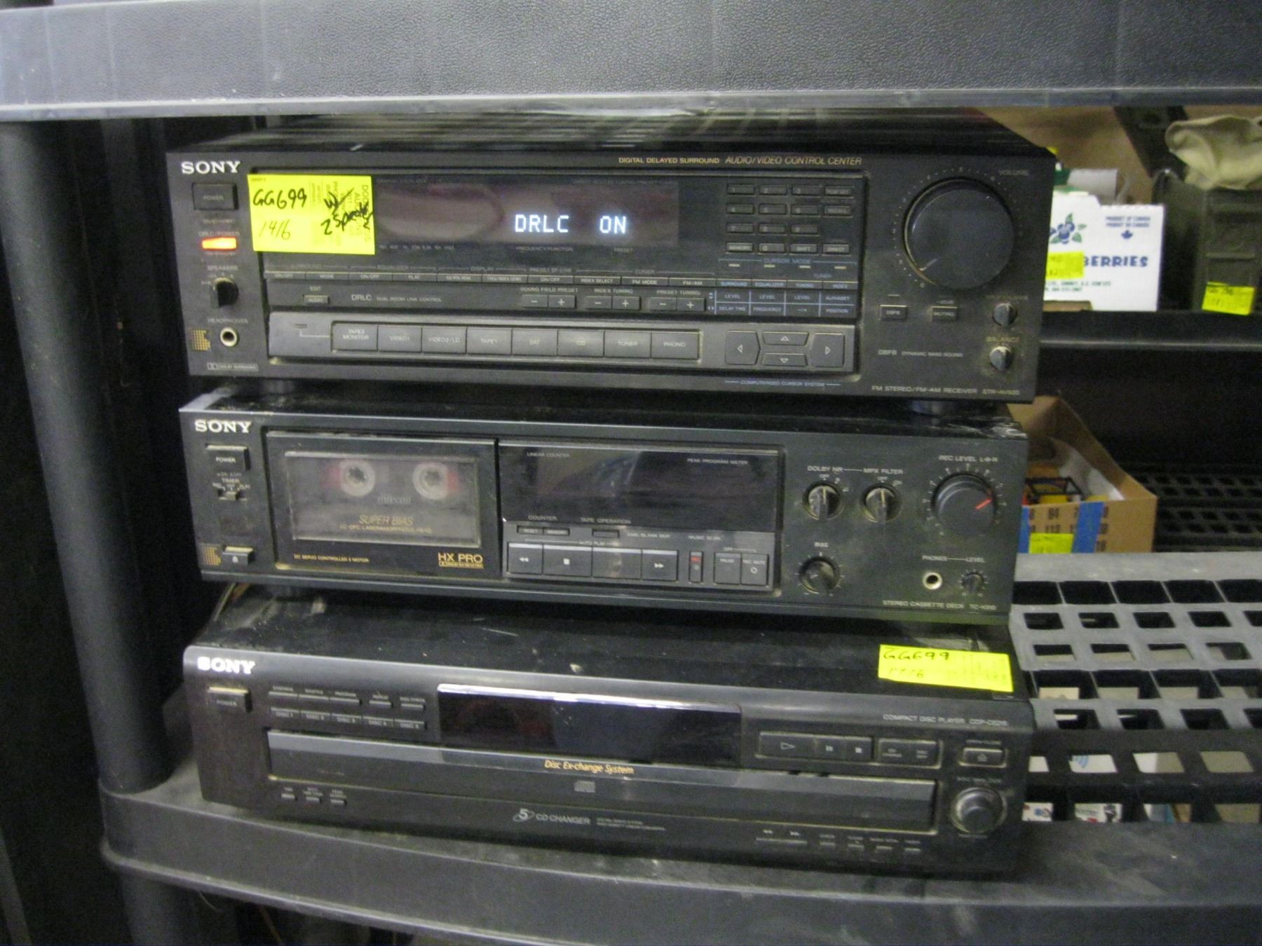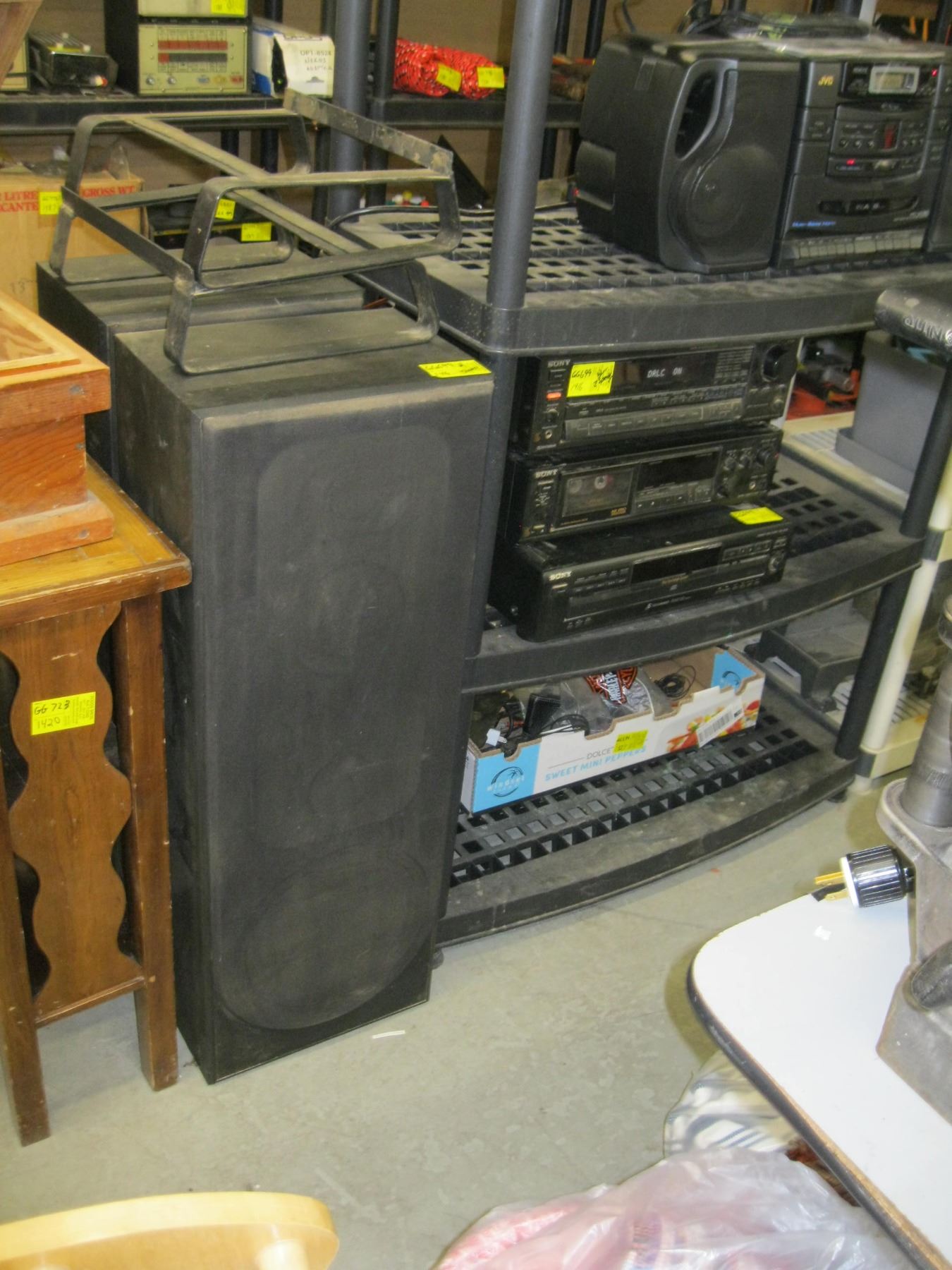 PAIR OF ACOUSTIC PROFILE RMS3500 SPEAKERS W/STANDS, SONY 5 DISC PLAYER ,CASSETE DECK & AMPLIER