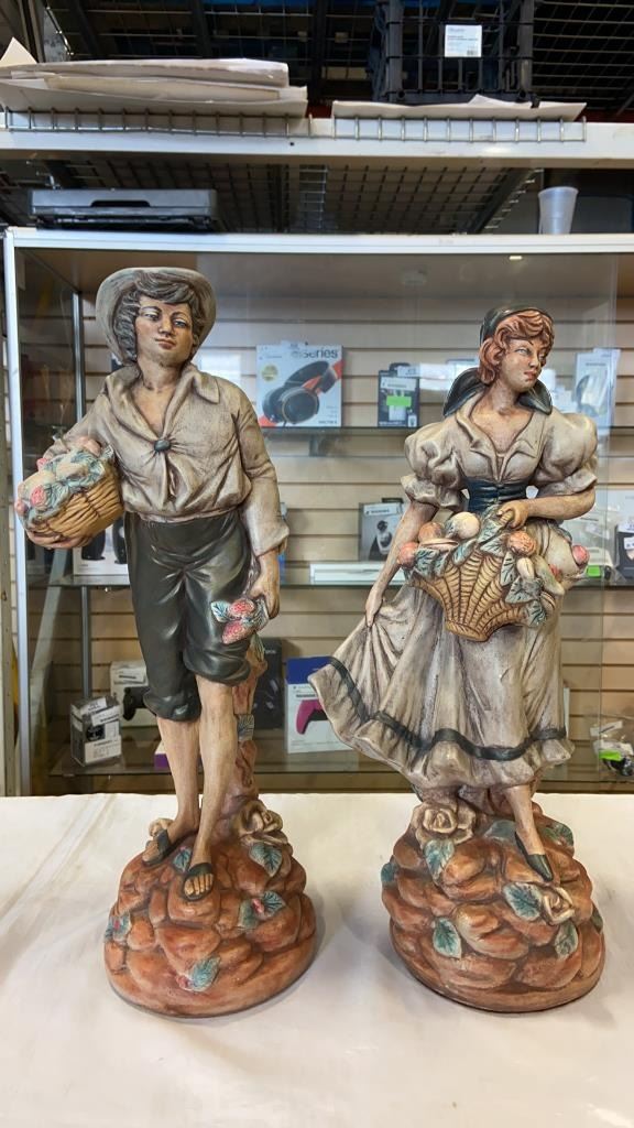 PAIR OF ANTIQUE HEAVY CERAMIC FIGURINES, 20 INCH TALL EACH
