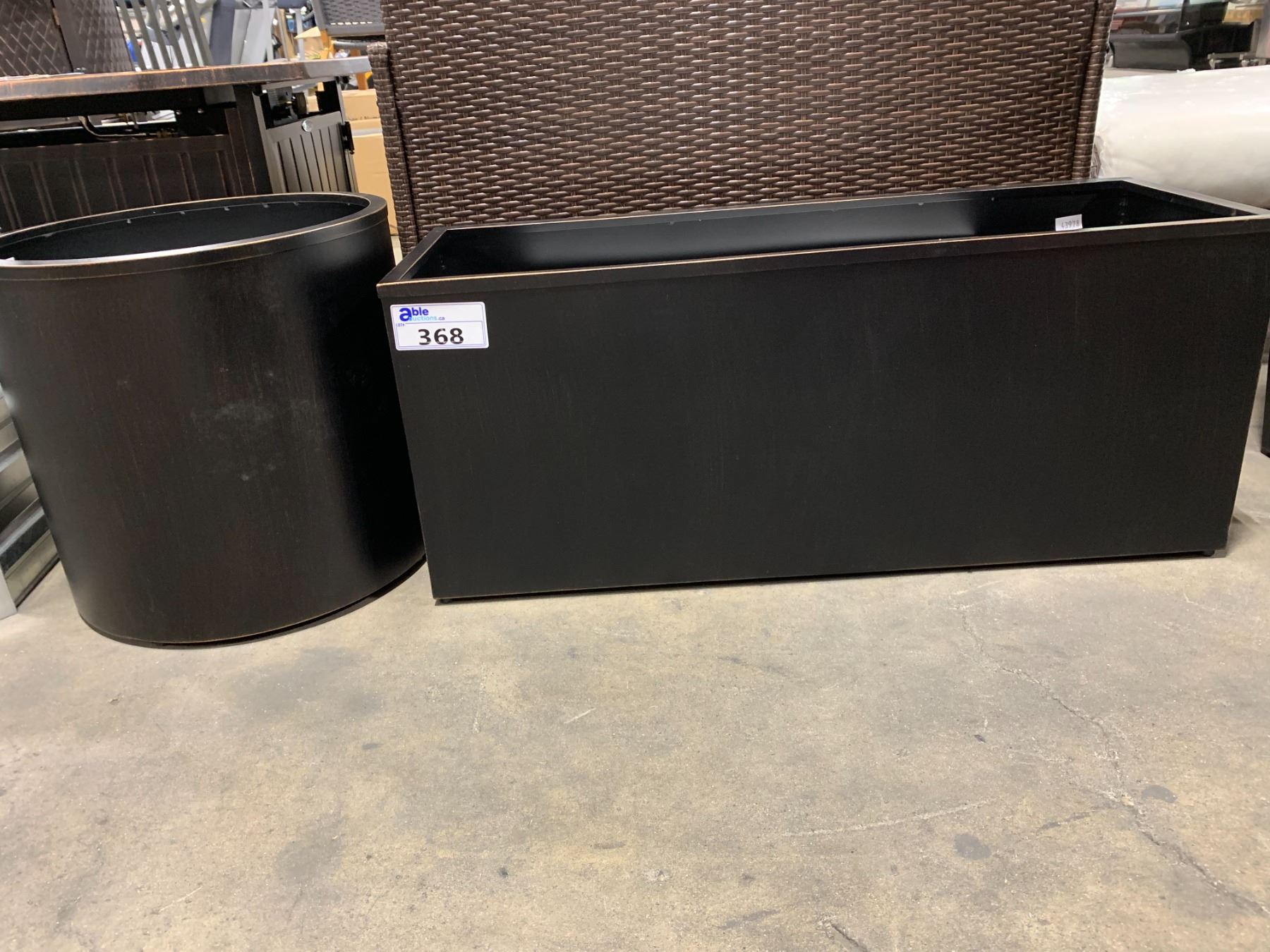 PAIR OF BLACK METAL PLANTER BOXES ( 1 RECTANGULAR & 1 ROUND ) & PAIR OF WHITE METAL PLANTER BOXES ( 1 RECTANGULAR & 1 ROUND )