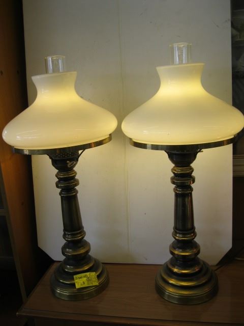 PAIR OF BRASS AND WHITE GLOBED LAMPS