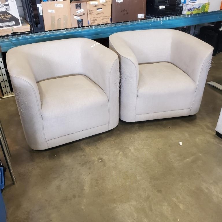 PAIR OF GREY FABRIC SWIVEL TUB CHAIRS, CAT TORN ON CORNER, NO STAINS