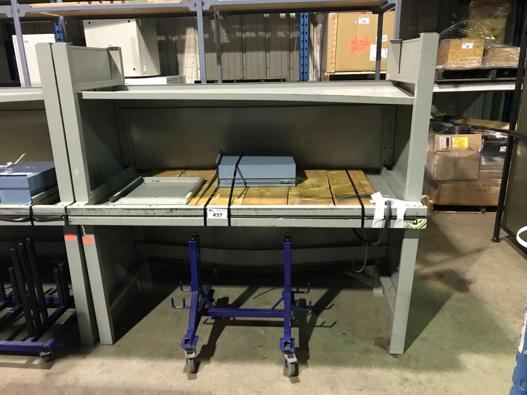 PAIR OF GREY METAL WORK BENCHES & BLUE METAL MOBILE SHOP CART
