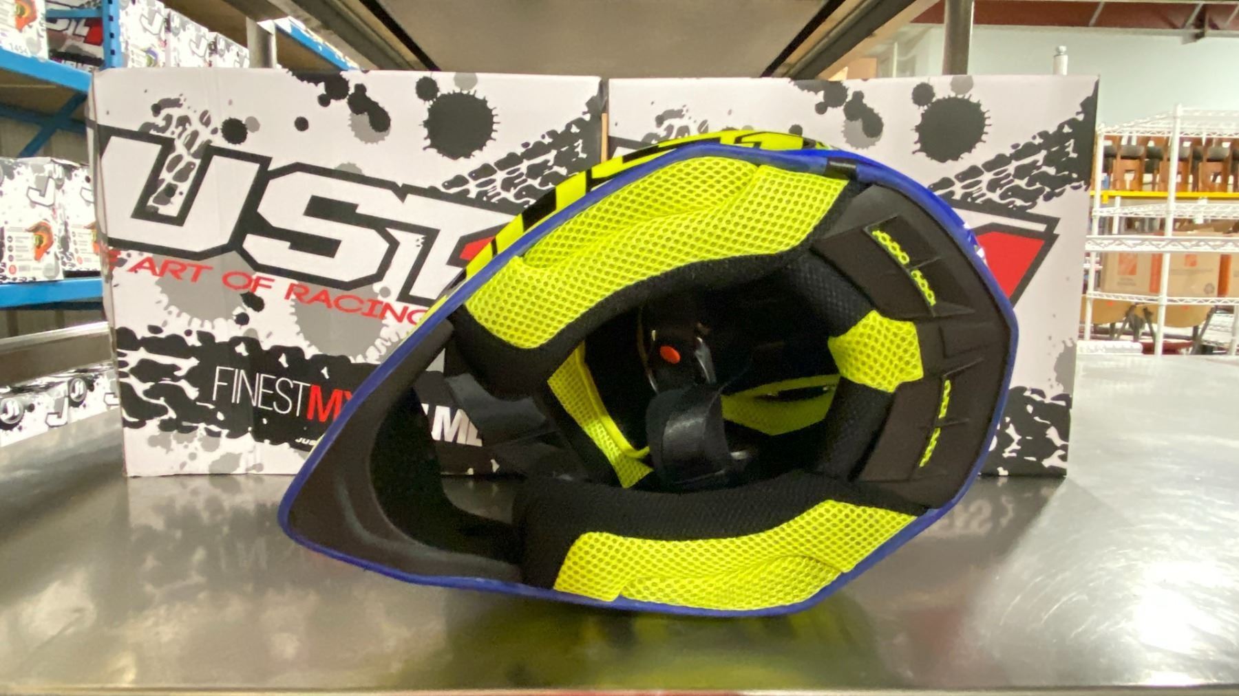 PAIR OF JUST1 RACING J38 BLADE ECE22/05 OFF ROAD RACING HELMETS COLOR BLUE, SIZE S/P *IN BOX*