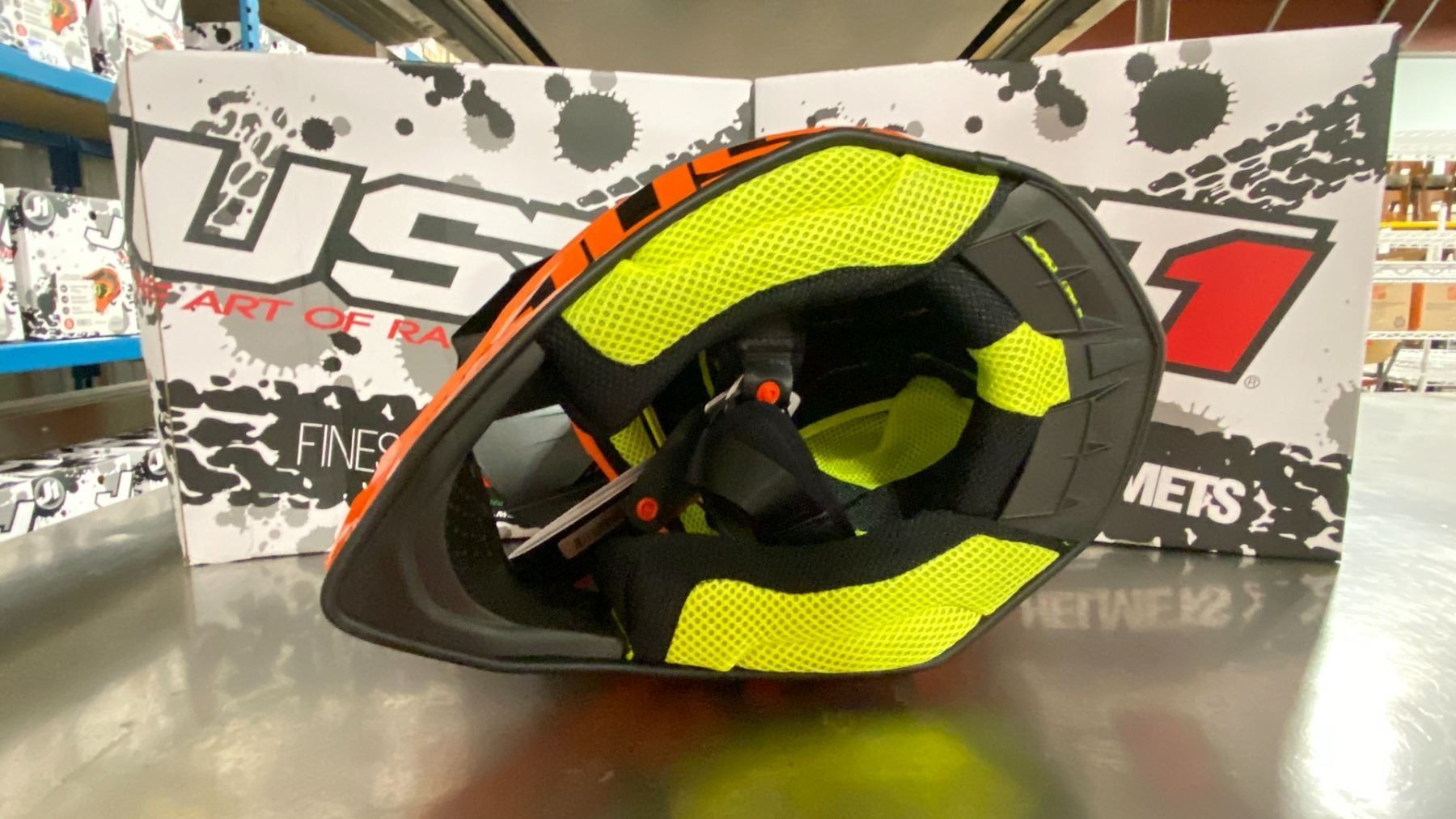 PAIR OF JUST1 RACING J38 BLADE ECE22/05 OFF ROAD RACING HELMETS COLOR ORANGE, SIZE MED *IN BOX*
