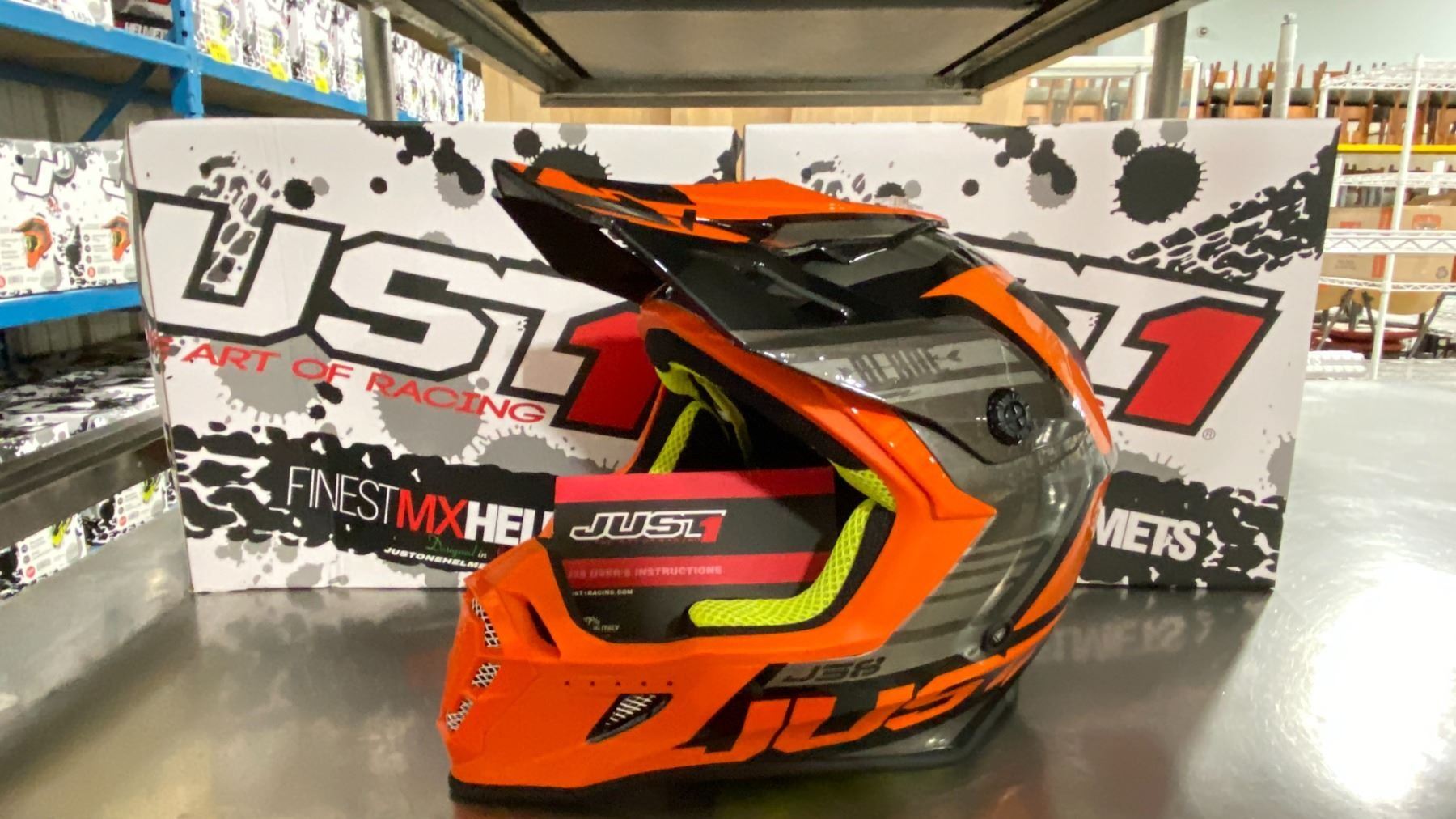 PAIR OF JUST1 RACING J38 BLADE ECE22/05 OFF ROAD RACING HELMETS COLOR ORANGE, SIZE S/P *IN BOX*