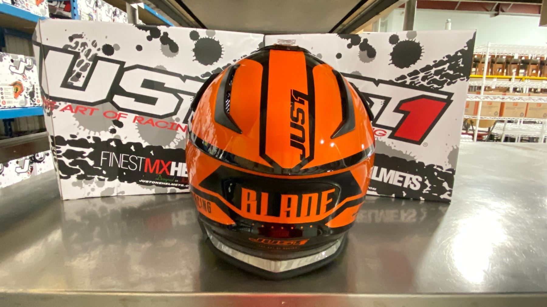 PAIR OF JUST1 RACING J38 BLADE ECE22/05 OFF ROAD RACING HELMETS COLOR ORANGE, SIZE S/P *IN BOX*