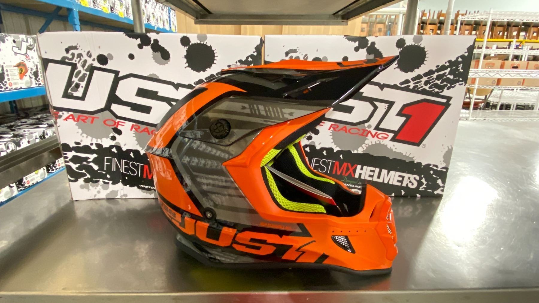 PAIR OF JUST1 RACING J38 BLADE ECE22/05 OFF ROAD RACING HELMETS COLOR ORANGE, SIZE XL *IN BOX*