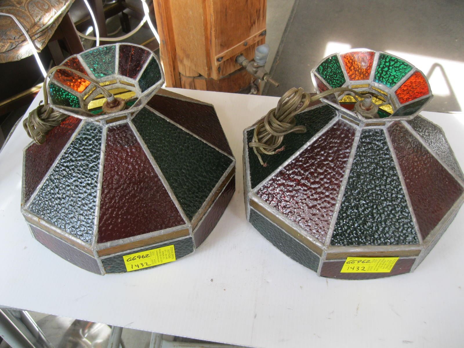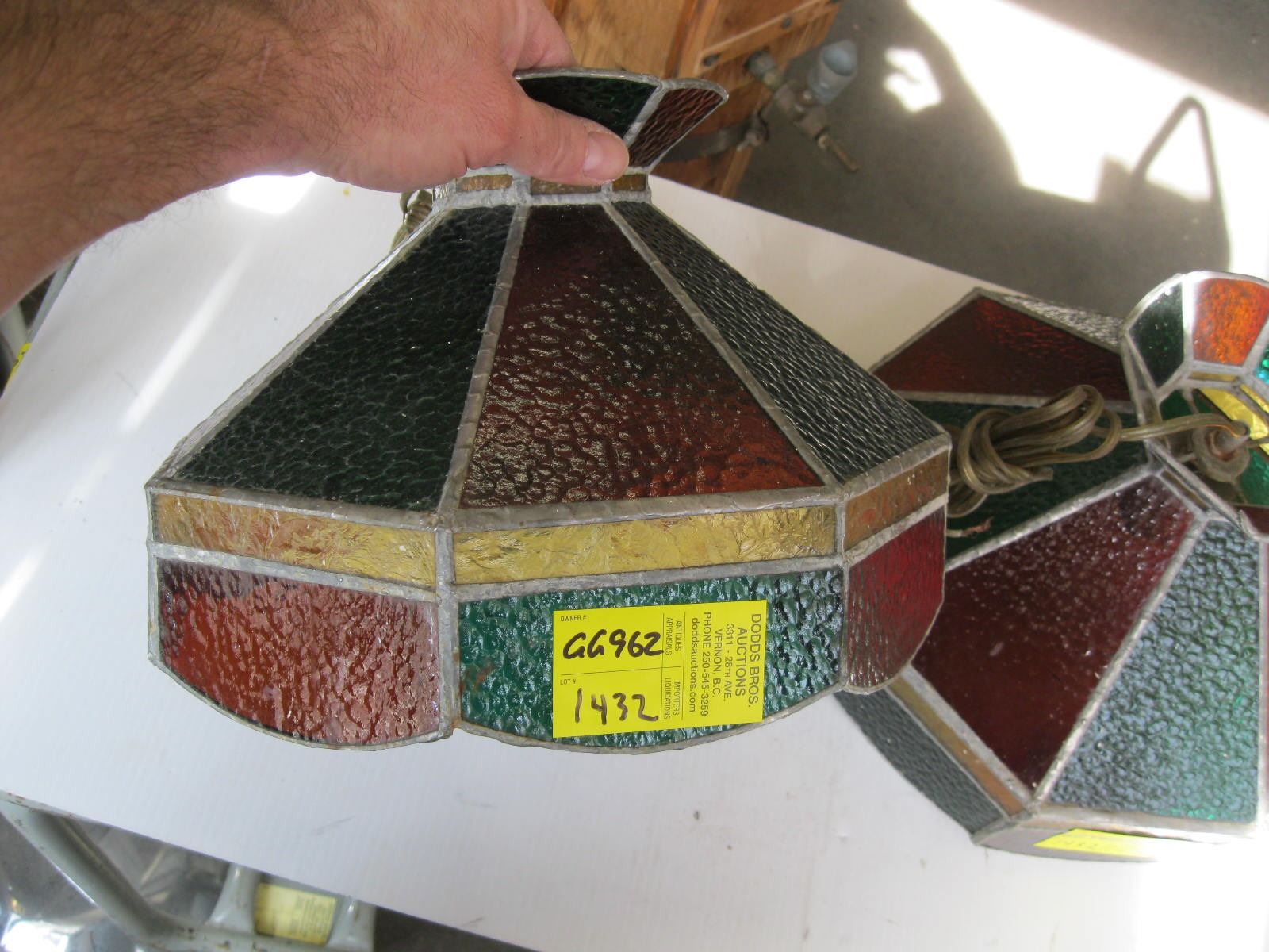 PAIR OF MATCHING LEADED GLASS HANGING LIGHT FIXTURES