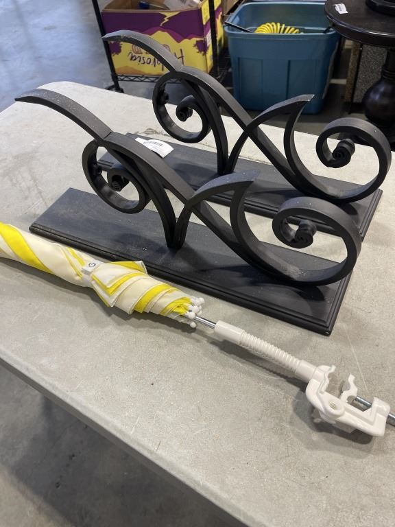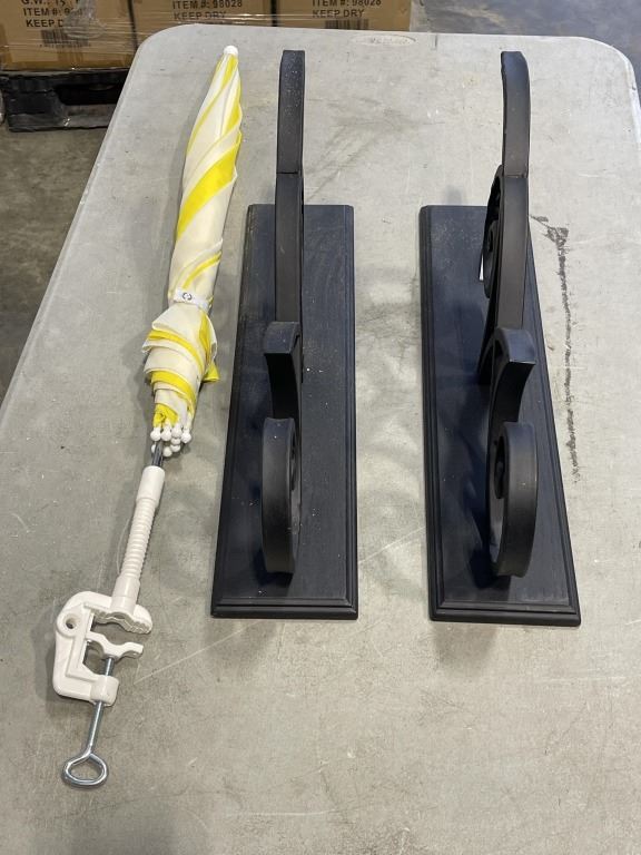 PAIR OF METAL WALL PLANTER HANGERS AND CLIP ON UMBRELLAS