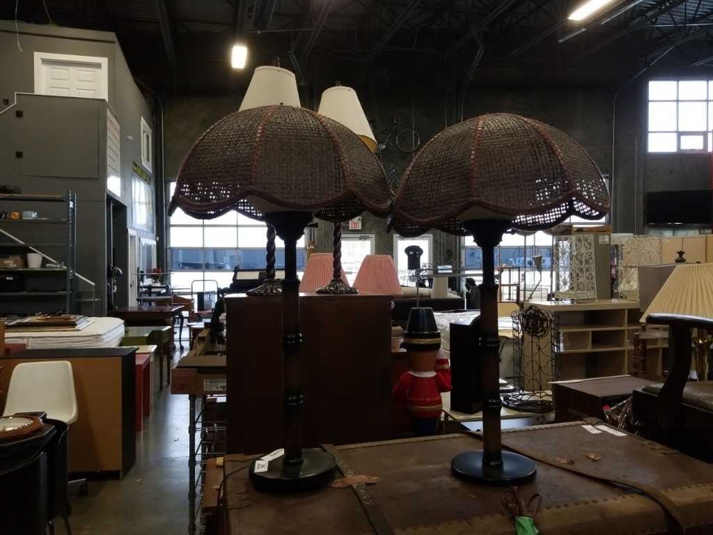 PAIR OF MID CENTURY TABLE LAMPS WITH GLASS GLOBES AND WICKER SHADES