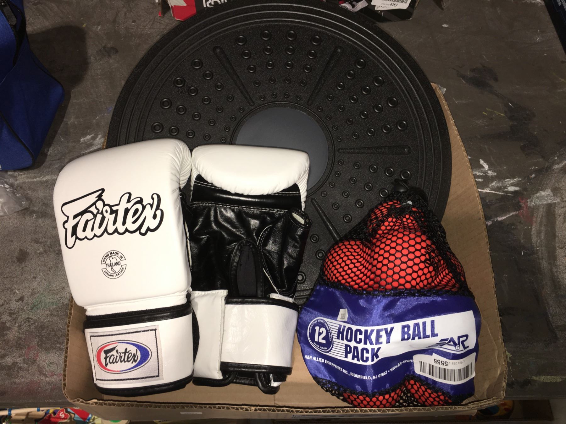 PAIR OF MIXED MARTIAL ARTS GLOVES & EXERCISE DISC & BAG OF HOCKEY BALLS