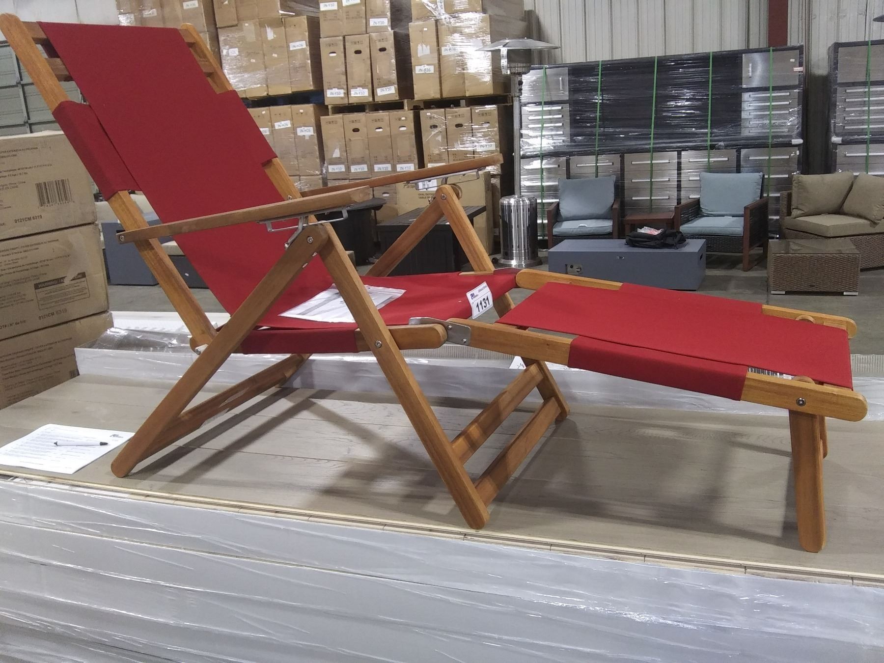PAIR OF PATIOFLARE WOOD FRAMED RED FABRIC BEACH CHAIRS WITH LEG RESTS *IN BOX ( 2 BOXES )*