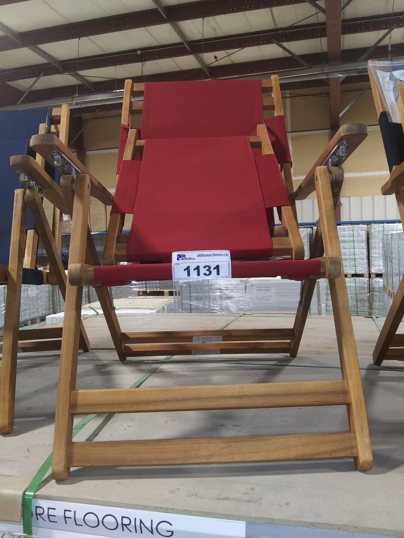 PAIR OF PATIOFLARE WOOD FRAMED RED FABRIC BEACH CHAIRS WITH LEG RESTS
