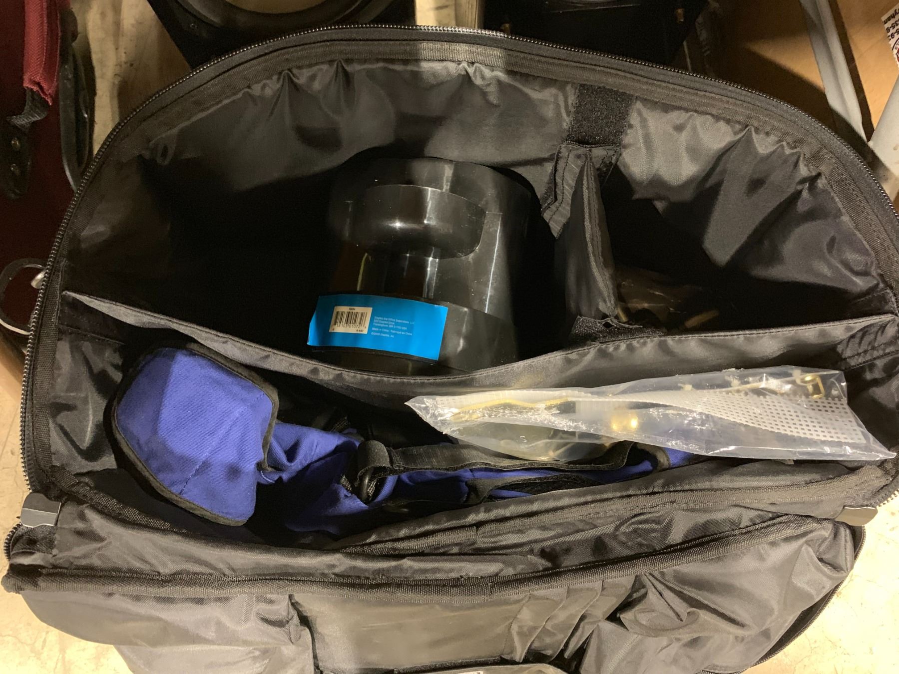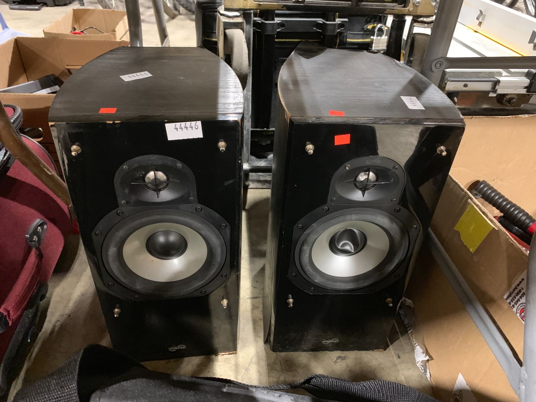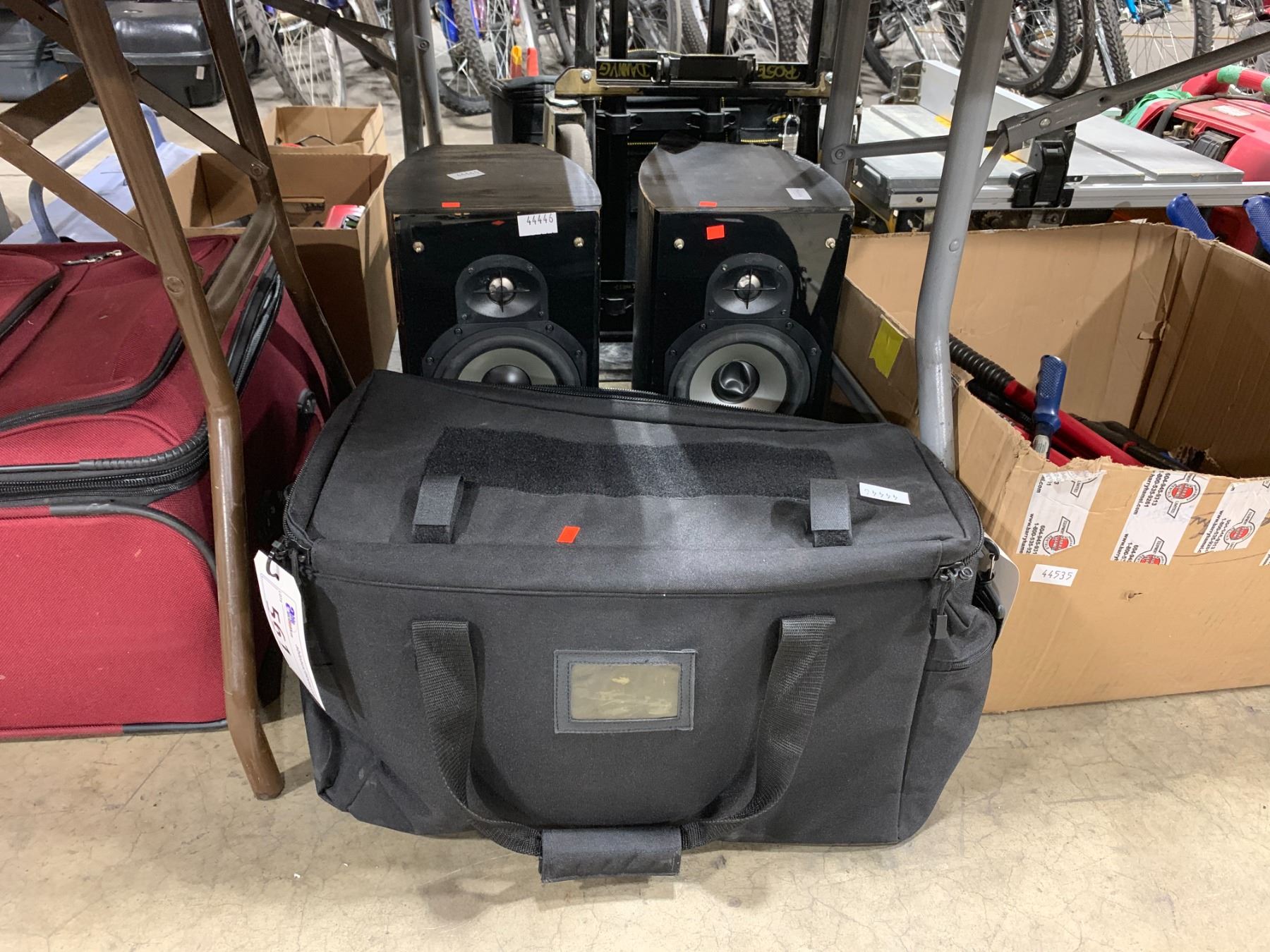 PAIR OF SOUNDSTAGE SPEAKERS & A BLACK DUFFEL BAG WITH CONTENTS