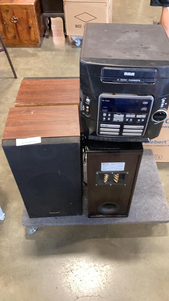 PAIR OF TECHNICS SB-L31 SPEAKERS WITH RCA 5 DISC CHARGER WORKING WITH SUTHERLAND SUB