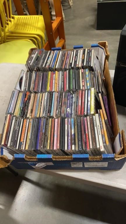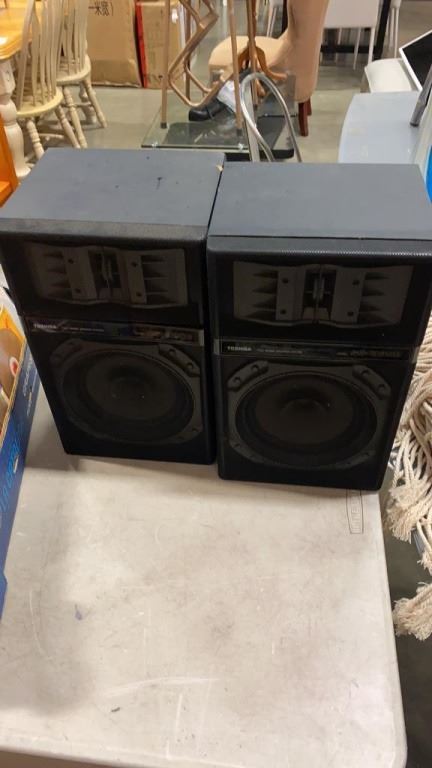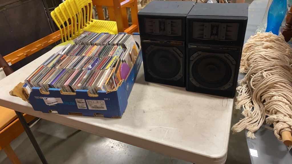 PAIR OF TOSHIBA SPEAKERS AND TRAY OF CDS