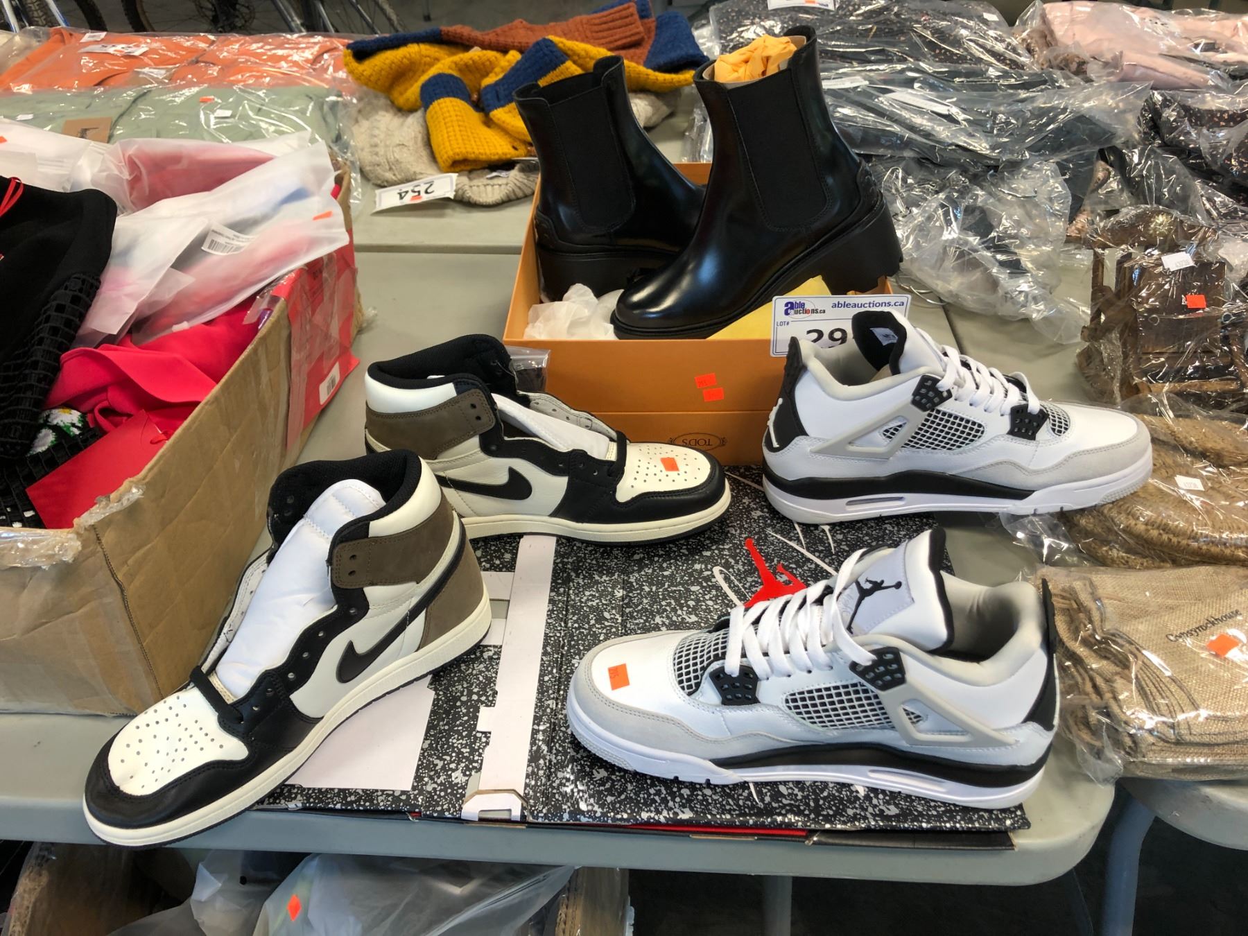 PAIR OF WHITE AIR JORDAN FLIGHT SHOES SIZE US8.5, PAIR OF WHITE NIKE AIR JORDAN SHOES SIZE US9 AND TOD'S BLACK LEATHER BOOTS SIZE 36 (US5/6)