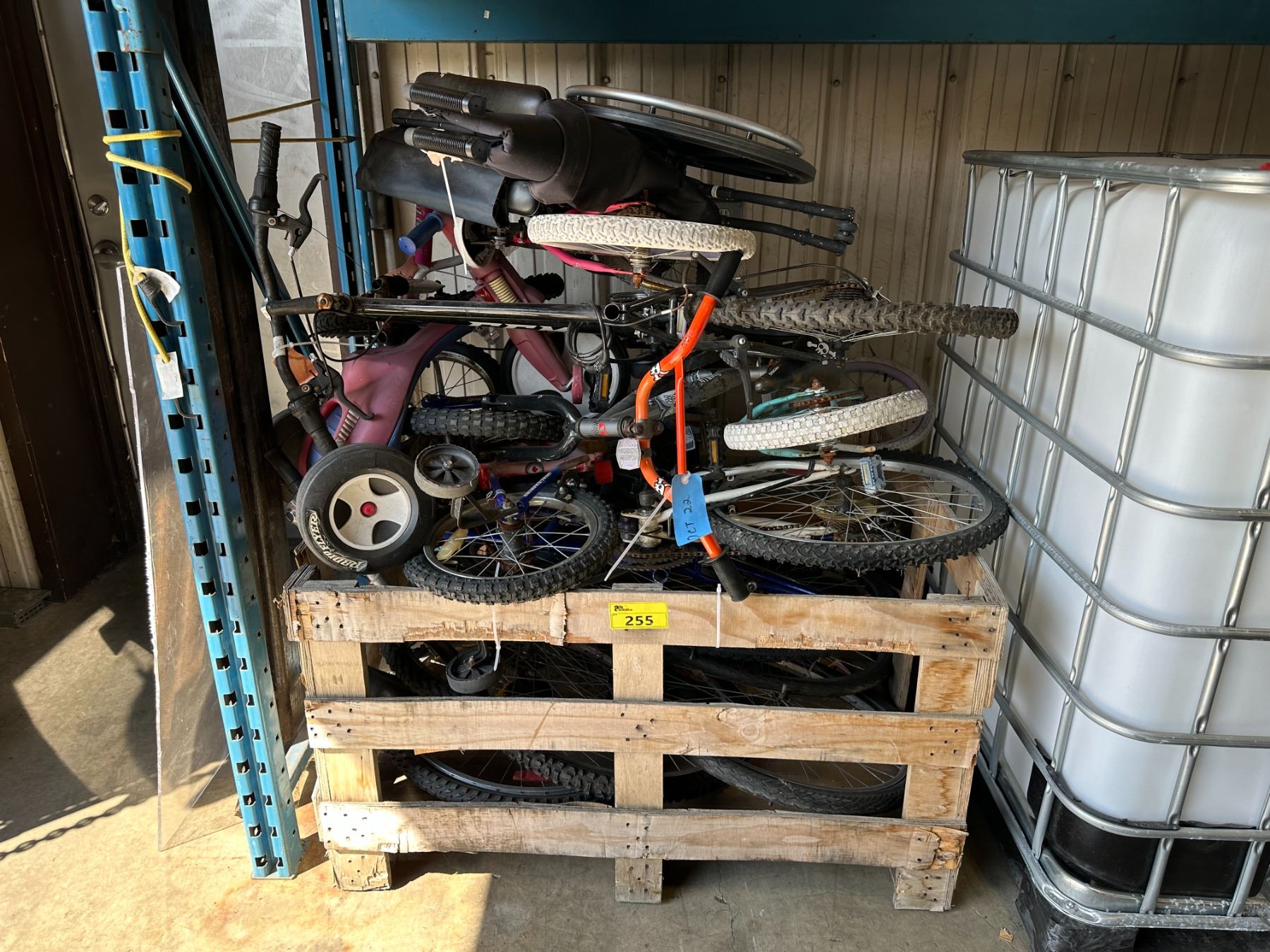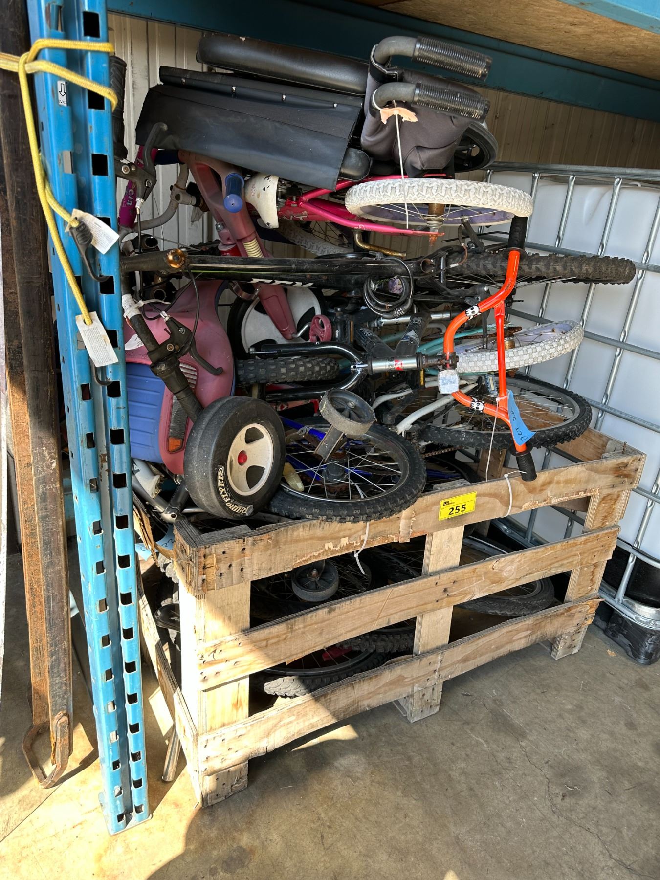 PALLET CRATE OF ASSORTED BIKE FRAMES, CHILDRENS BIKES, WHEELCHAIR, TIRES & PARTS