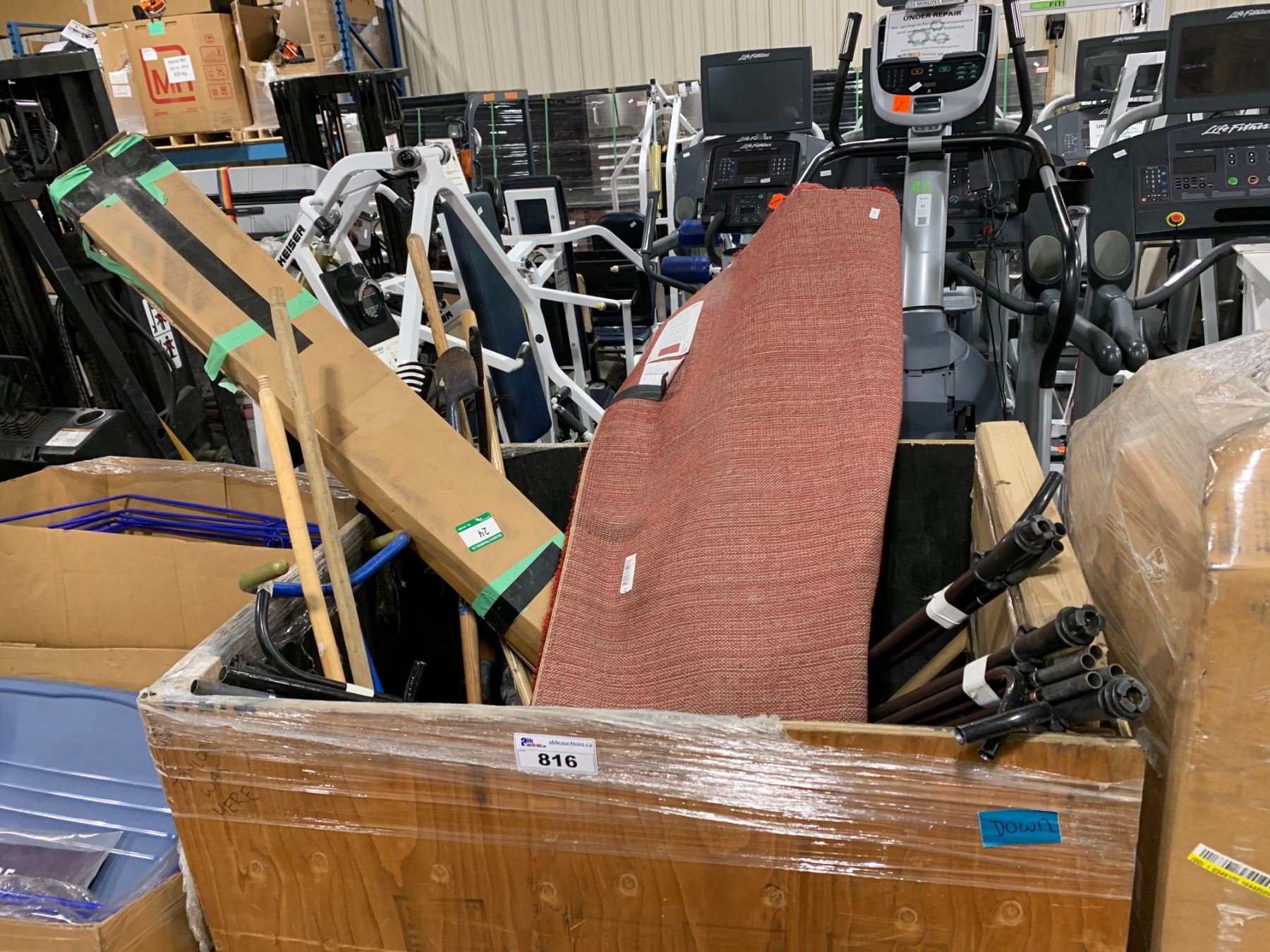 PALLET CRATE OF ASSORTED YARD TOOLS & RUG