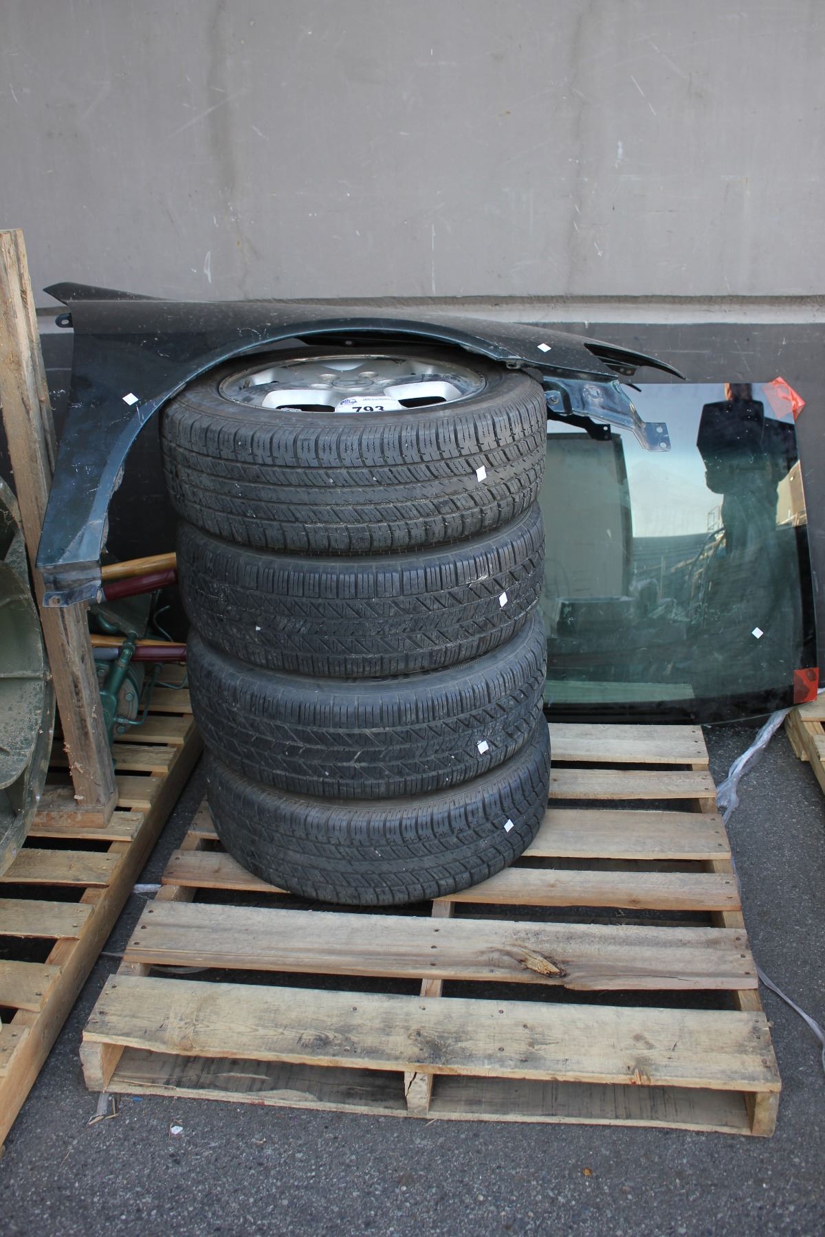 PALLET INCLUDING 4 TIRES, WINDSHIELD AND CAR PART