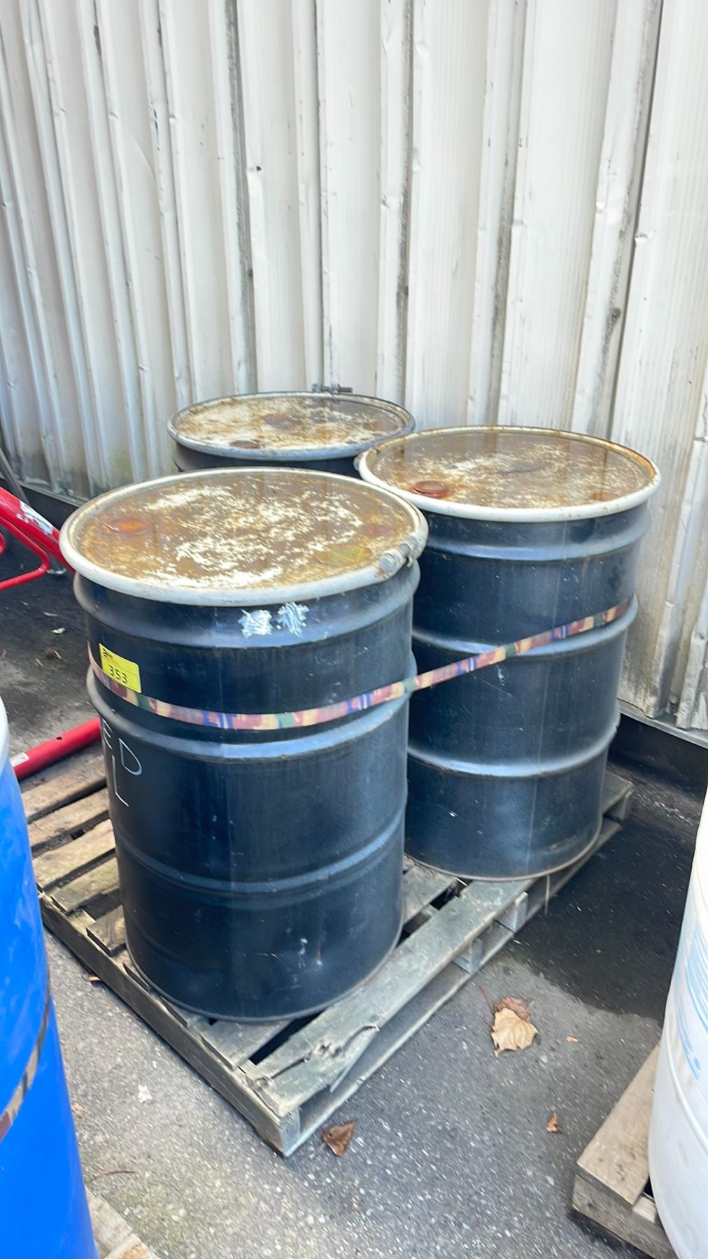 PALLET OF 3 METAL BARRELS OF ASSORTED USED INDUSTRIAL OIL