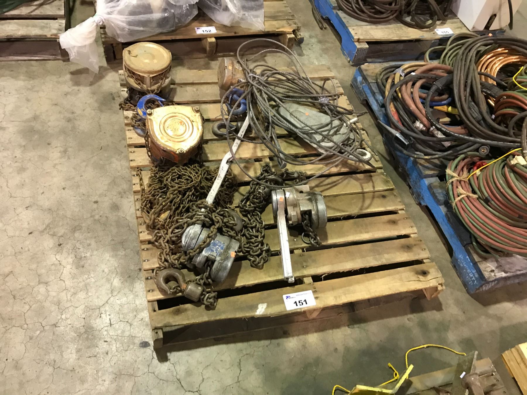PALLET OF ASSORTED CABLE PULLS, COME-A-LONGS & CHAIN HOISTS